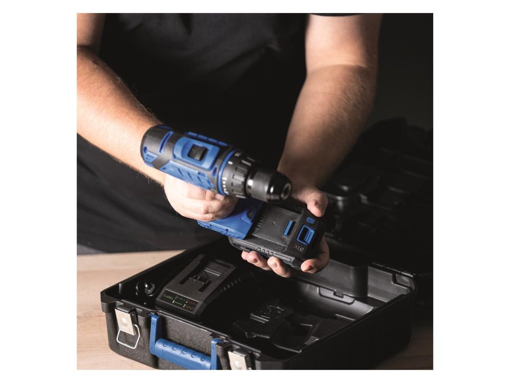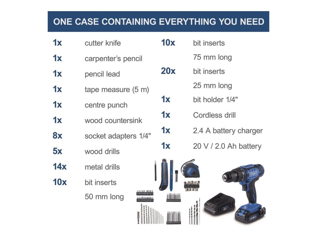 Súprava obsahuje výkonný akumulátorový vŕtací skrutkovač, nabíjačku, akumulátor a 74-dielnu sadu príslušenstva, takže zvládnete všetky práce doma, na záhrade, na stavbe alebo na cestách.