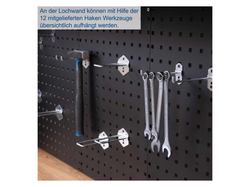 Súprava obsahuje jednu skriňu, závesnú skriňu, pracovný stôl, dva pojazdné dielenské vozíky, perforovanú stenu a dvanásť háčikov, vďaka ktorým bude vaša dielňa dokonale usporiadaná.