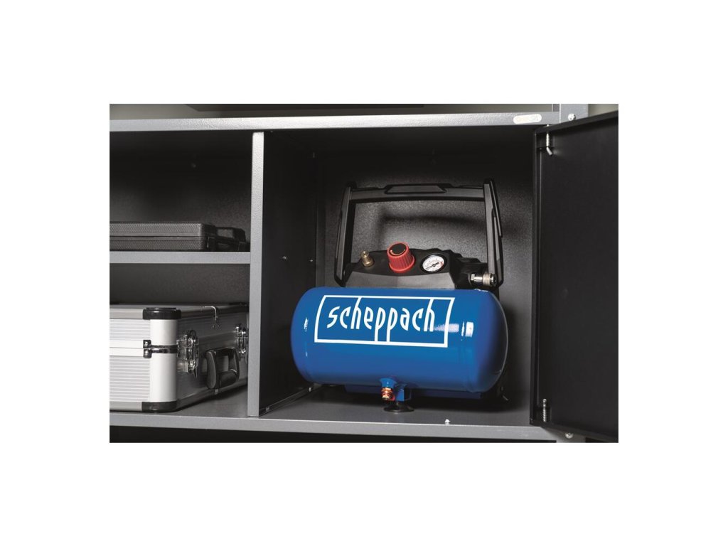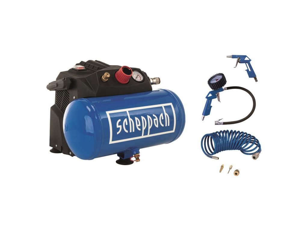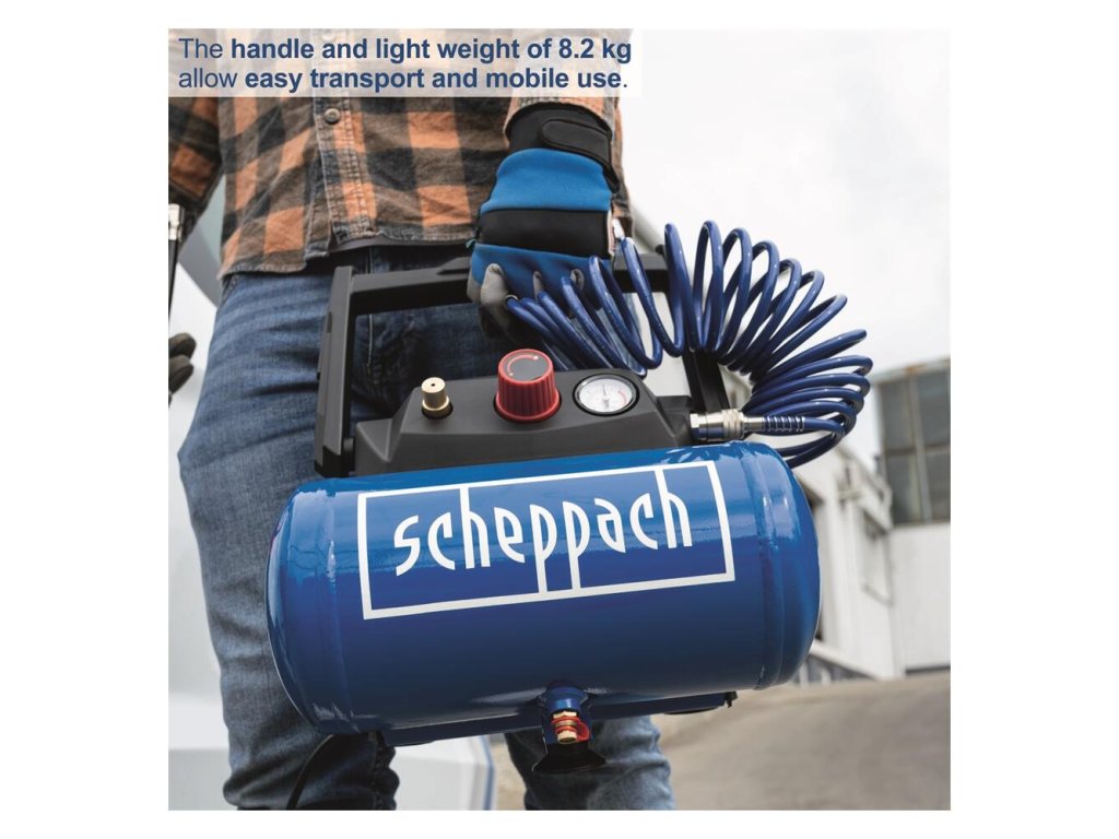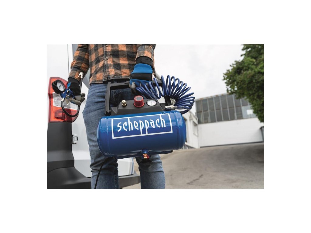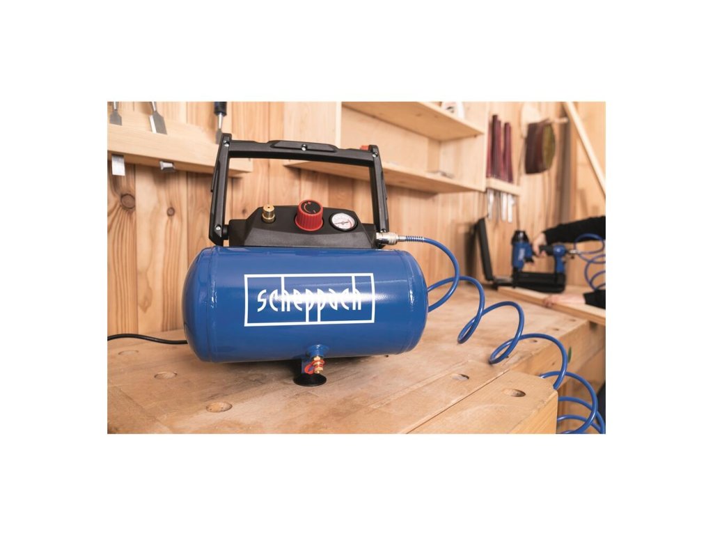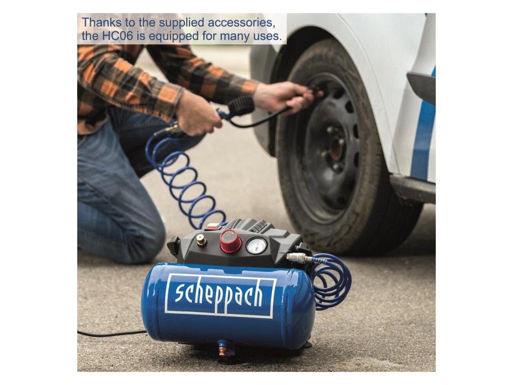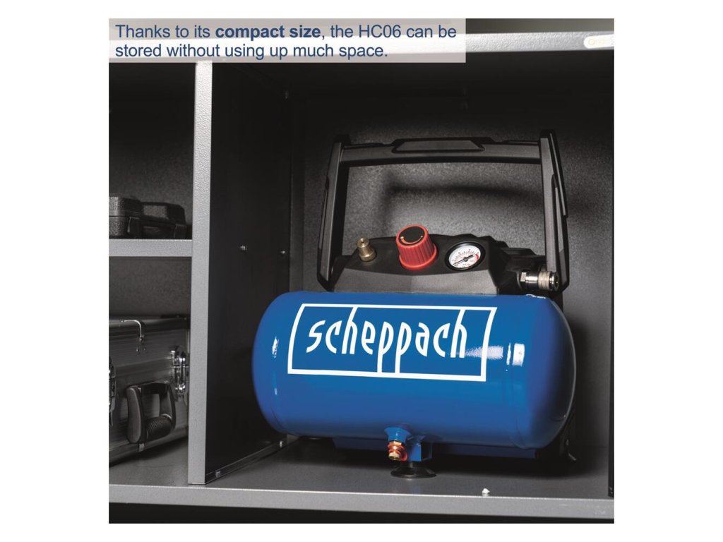 Kompresor Scheppach HC 06 je praktický, ľahký a ľahko prenosný kompresor so 6 l tlakovou nádobou a výkonným motorom s príkonom 1200 W.