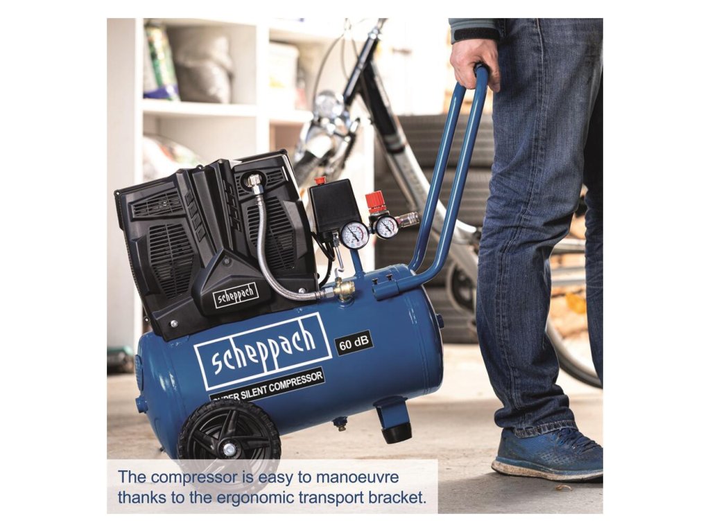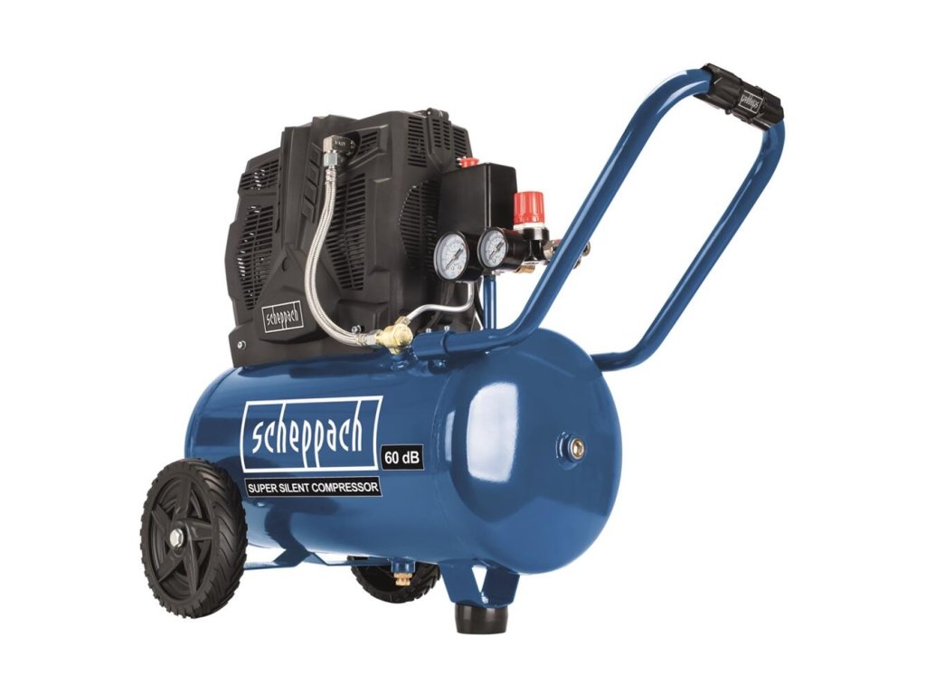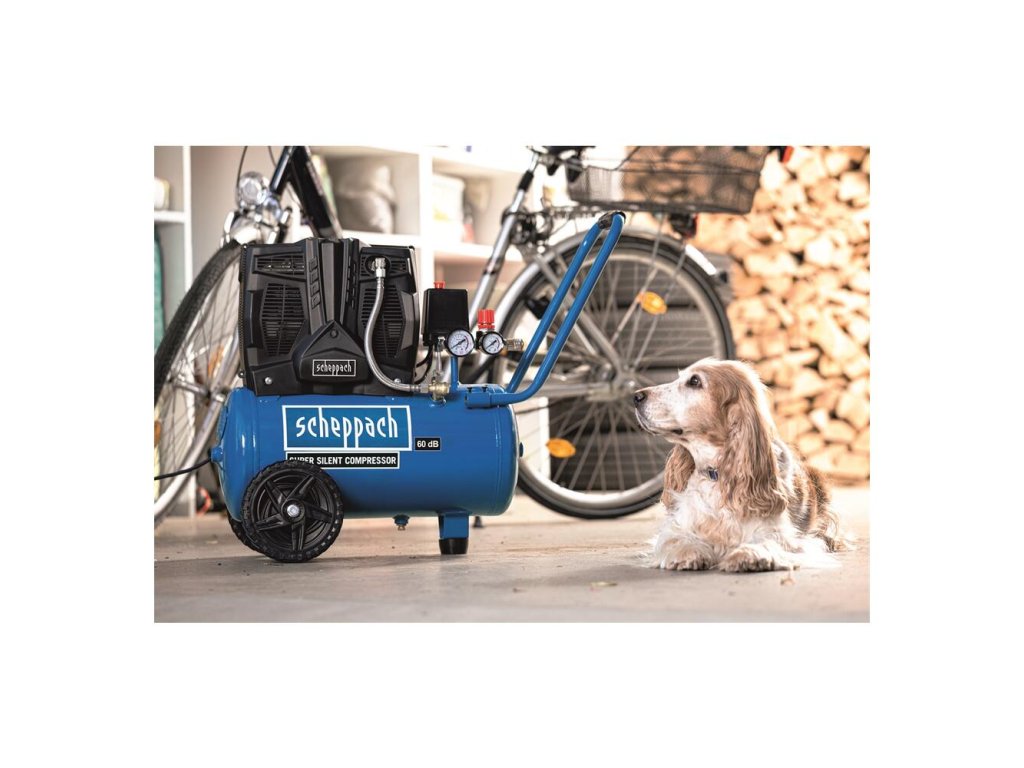 Kompresor Scheppach HC 25 Si je tichý bezolejový dvojvalcový kompresor, ktorý je vhodný aj na miesta a do prevádzok s vysokými požiadavkami na nízku hladinu hluku.