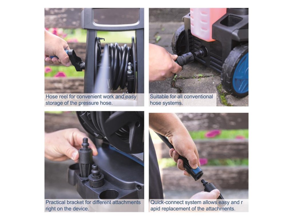 Základné príslušenstvo, ako je tlaková pištoľ a elektrický kábel, možno počas skladovania pohodlne umiestniť priamo do držiakov na umývačke, zatiaľ čo tlaková hadica je navinutá na otočnom bubne.