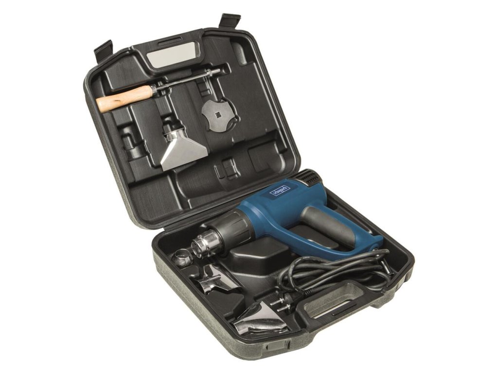 Teplovzdušná pištoľ sa dodáva v praktickom plastovom kufríku s bohatou 5-dielnou súpravou príslušenstva.