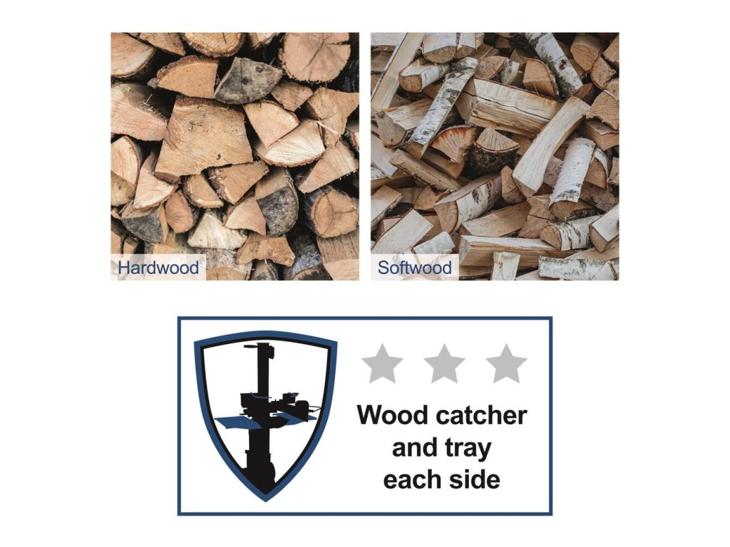 K stroju je možné pridať prídavný nadstavec alebo štvorramenný klin, ktoré sú ideálne na štiepanie hrubších alebo dlhších kmeňov.