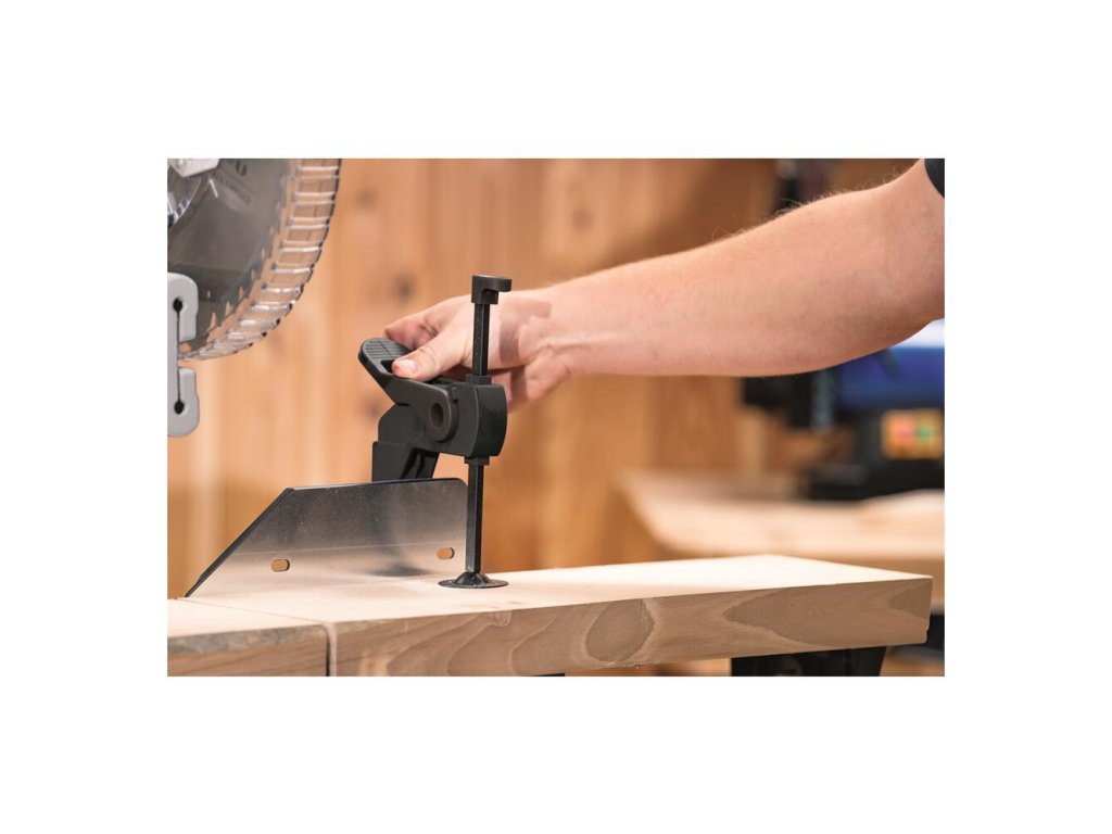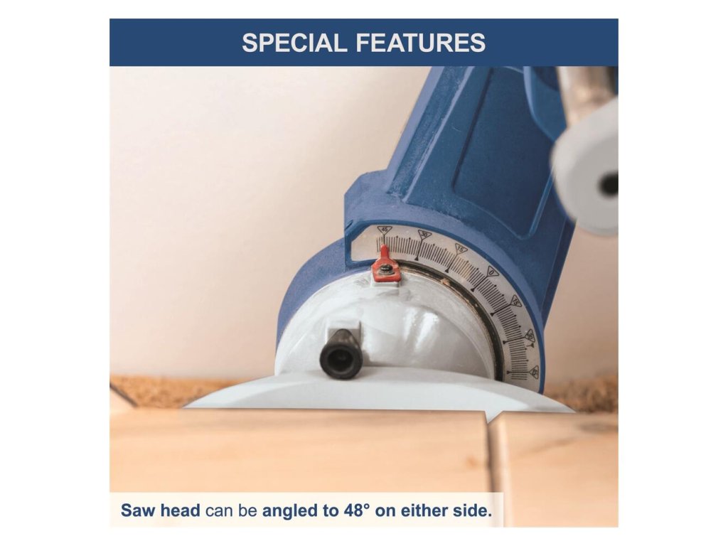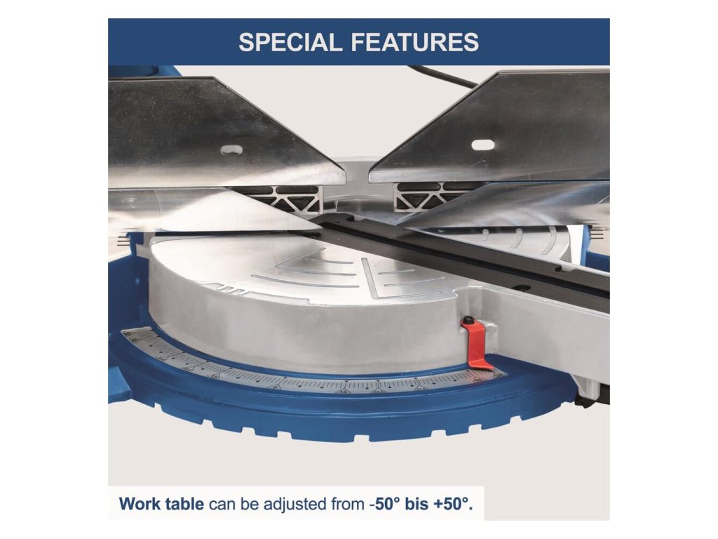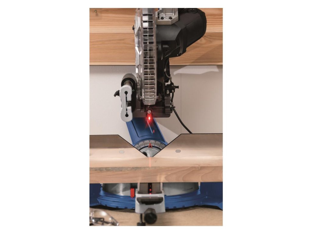 Píla je vybavená laserom na presnú kontrolu rezu, prehľadným pravítkom, dvoma predlžovacími stolíkmi, rýchloupínacím systémom na nastavenie uhla rezu, vreckom na prach a upínačom.