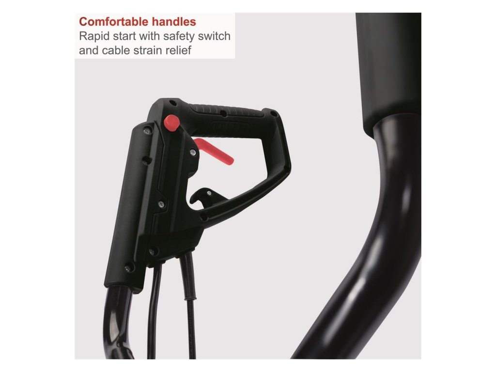 Je vybavený 16 špeciálne tvarovanými nožmi, výkonným 1050 W motorom, kovovou prevodovkou pre dlhú životnosť, skladacími riadidlami na jednoduchú prepravu alebo skladovanie, ergonomickými rukoväťami, hákom na ukotvenie elektrického kábla a bezpečnostným spínačom.