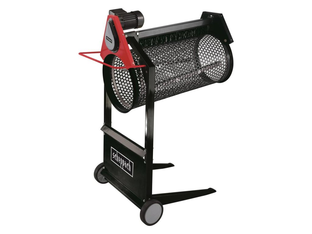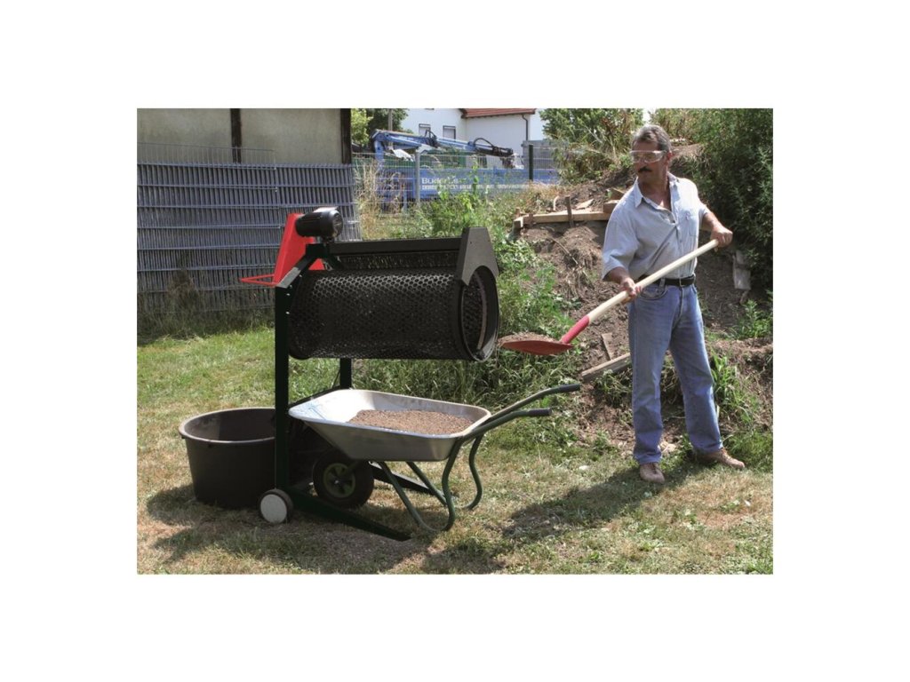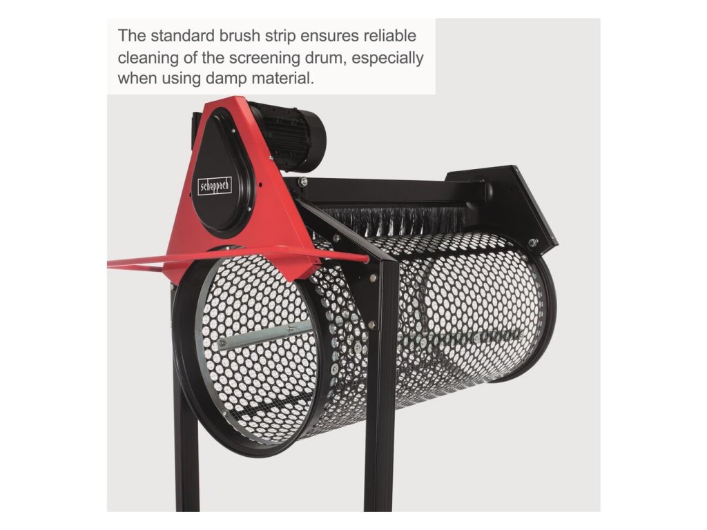 Sklon bubna je nastaviteľný, bubon je vybavený kefou, ktorá priebežne čistí otvory aj pri práci s mokrým materiálom, a celý stroj je vybavený dvoma kolieskami na jednoduchú prepravu.