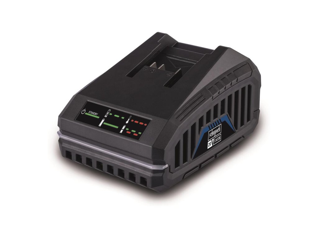 Scheppach SBC4.5A je veľmi rýchla nabíjačka, ktorá dokáže nabíjať všetky lítium-iónové batérie Scheppach radu IXES s napätím 20 V.