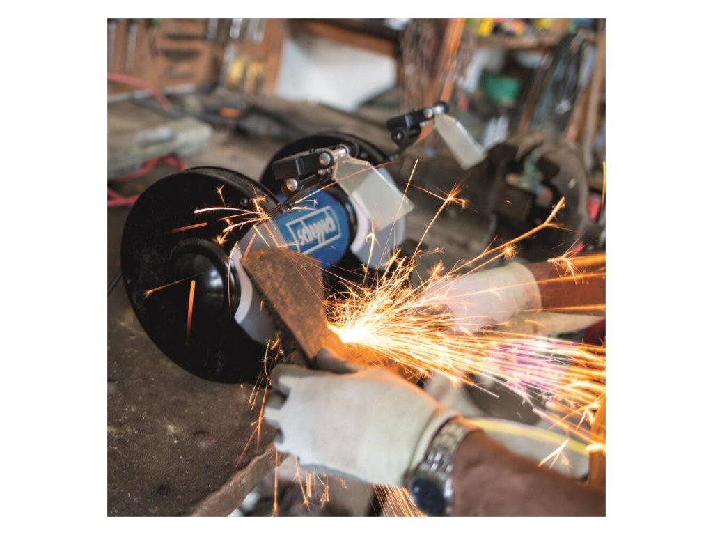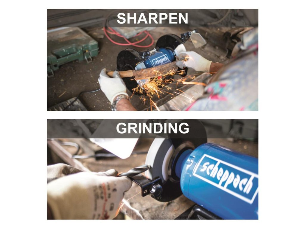 Dva brúsne kotúče s rôznou zrnitosťou a šírkou a priemerom 200 mm slúžia na veľmi jemné a hrubšie brúsenie a postačujú na väčšinu bežných dielenských prác, ako je brúsenie, leštenie alebo ostrenie.