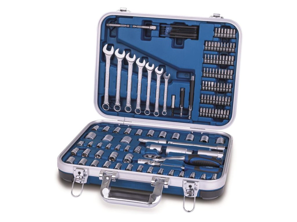 Obsahuje: 1x prepravný kufrík, 1x magnetický držiak 60 mm, 1x magnetický držiak 80 mm, 1x nastaviteľný magnetický držiak 120 mm, 67x šesťhranné bity 1/4"" 25 mm, 7x bočný kľúč s očkom 8/10/11/12/13/14/15 mm, 8x imbusový kľúč 1,5 - 8 mm, 2x adaptér pre bity 50 mm: 1/4 x 1/4"" a 3/8 x 1/4"", 13x nástrčná matica 1/4"", 4/4,5/5/5,5/6/7/8/9/10/11/12/13/14 mm, 14x nástrčná matica 3/8"", 8/9/10/11/12/13/14/15/16/17/18/19/20/21 mm, 1x predĺženie (spojka) 1/4"", 5x nástrčná matica 1/4"", E 4/5/6/7/8 mm, 6x nástrčná matica 3/8"", E 10/11/12/14/16/18 mm, 2x predĺženie na zapaľovaciu sviečku 1/2"" 16 a 21 mm, 1x rukoväť štvorhranná 1/4"", 2x predĺženie štvorhranné 3/8"" 3"" a 6"", 1x adaptér 1/4 ""F x 3/8 ""M, 1x adaptér štvorhranný 1/2 ""M x 3/8 ""F, 1x stredová račňa 3/8"", 1x kardanový kĺb 3/8""