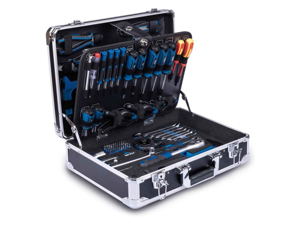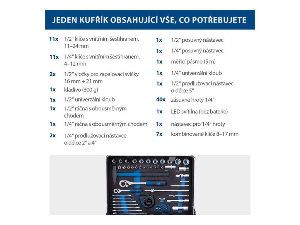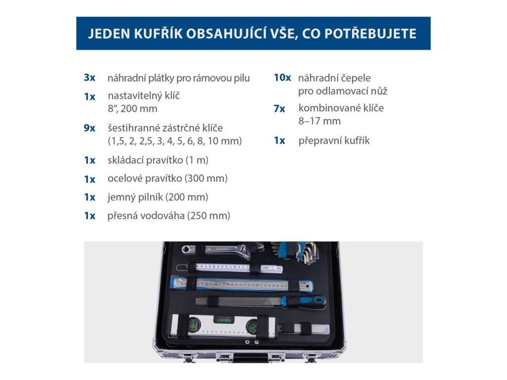 Nájdete v nej nielen všetky bežné kľúče, skrutkovače, box na bity, račne, matice, ale aj meter, vodováhu, pilník, kliešte, kladivo, pílu, nôž, skúšačku, sadu svoriek, baterku a ďalších užitočných pomocníkov.