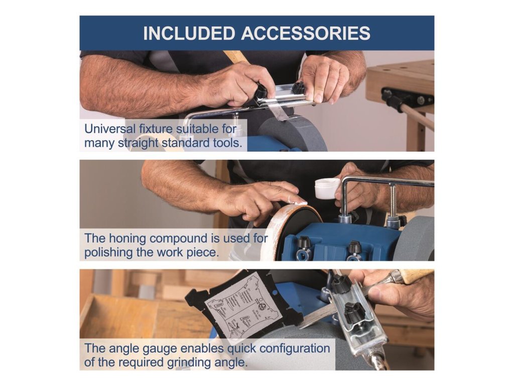 sa dodáva uhlomer, brúska s rovným ostrím a brúsna pasta.Podľa potreby je možné dokúpiť veľké množstvo ďalšieho príslušenstva.