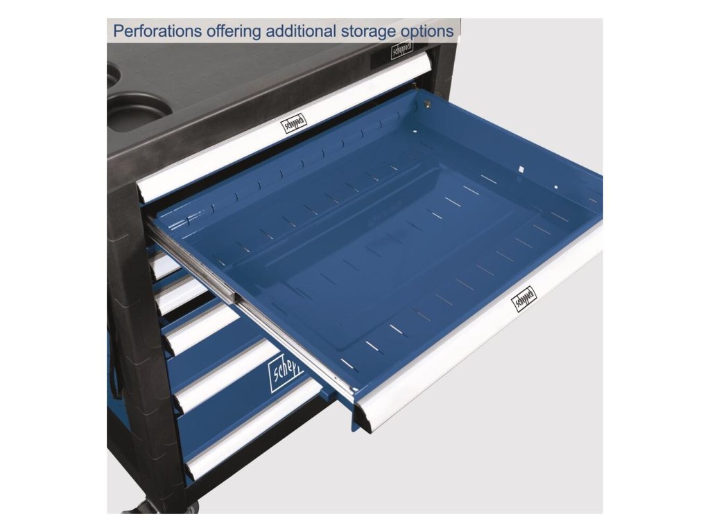 Vyznačuje sa veľmi pevnou konštrukciou, tvrdeným plastovým opláštením po okrajoch vozíka, pracovnou plochou z odolného plastu s výliskami na odkladanie drobného materiálu a nízkym ochranným okrajom, ktorý udrží vaše náradie vždy na mieste.
