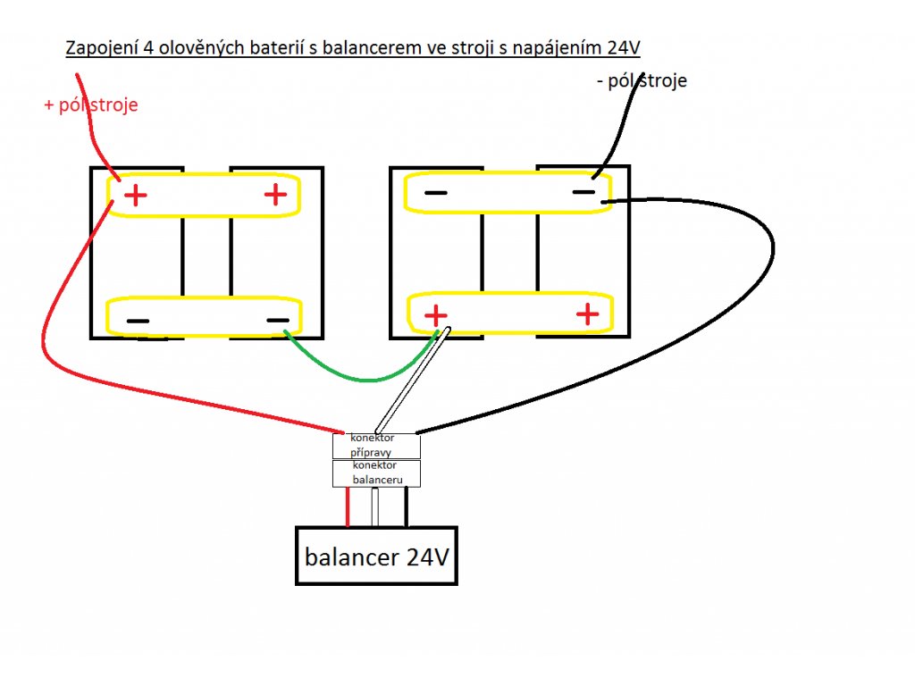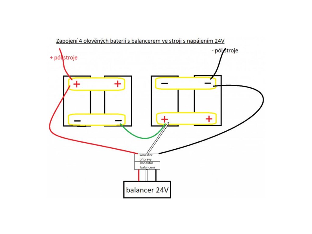 Balancer olovených akumulátorov 24V je vhodný pre elektrické vozíky SELVO s dvoma sériovo zapojenými akumulátormi.