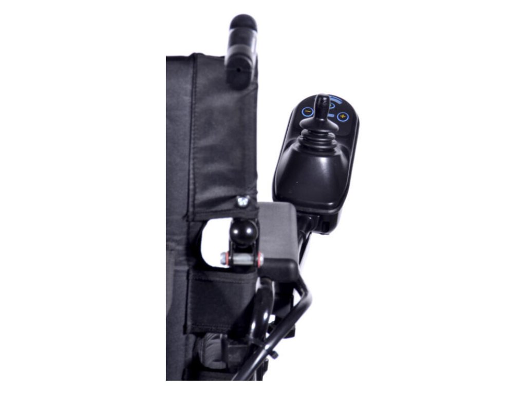 - Jednoduché ovládanie joystikom na ovládacom paneli umiestnenom na lakťovej opierke, volíte rýchlosť i smer jazdy a sledujete stav nabitia batérií.