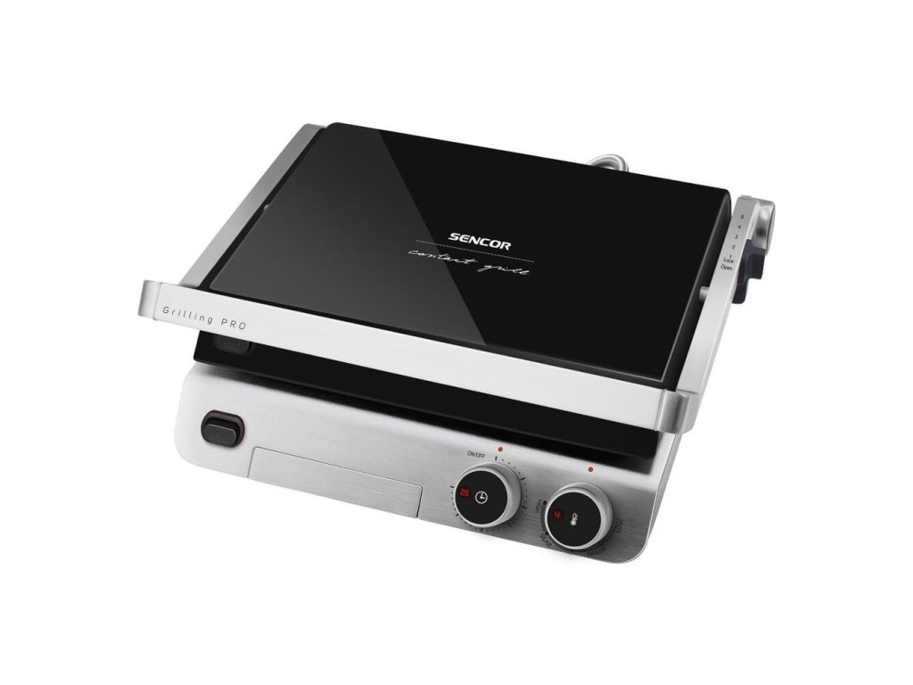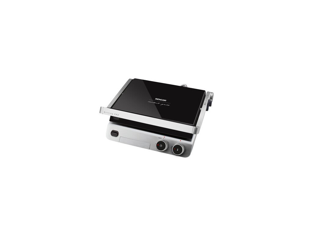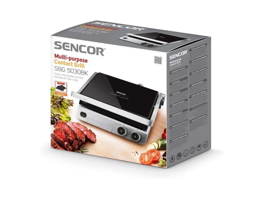 KOntaktný gril značky SENCOR s produktovým označením SBG 5030 BK. Jedná sa o viacúčelový gril s exkluzívnym skleneným dizajnom.