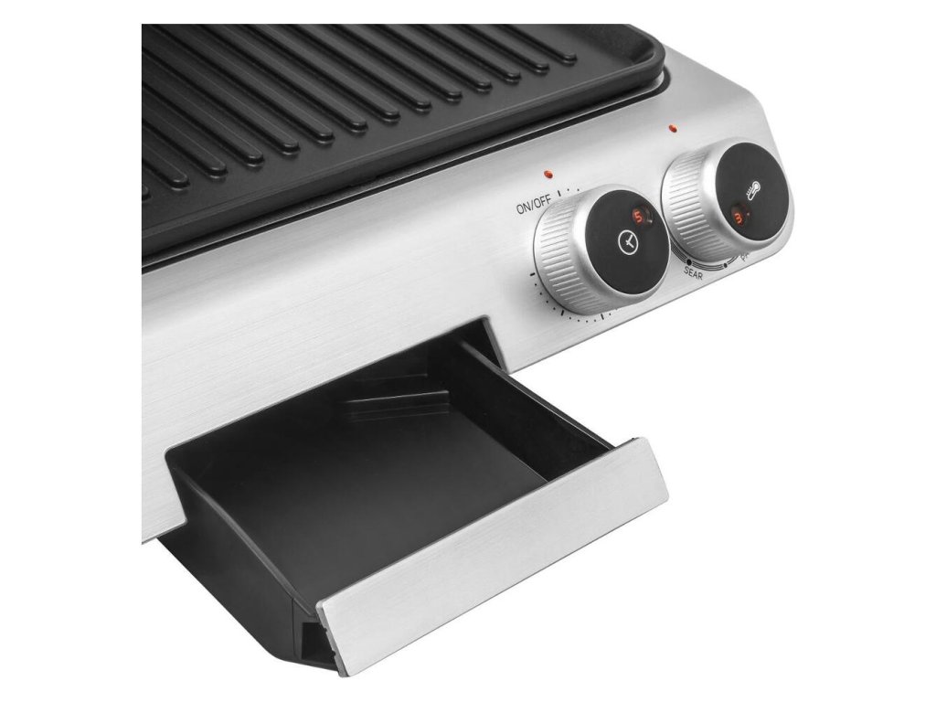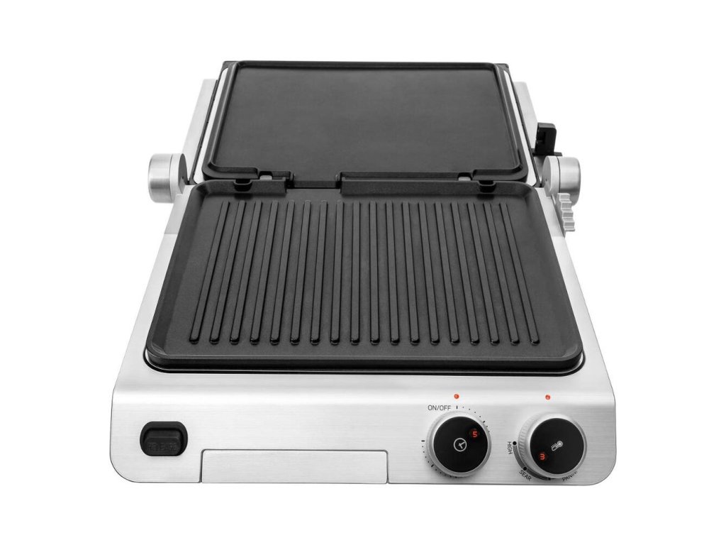 - Gril využíva dva typy dosiek: horná hladká doska a spodná vrúbkovaná grilovacia doska.