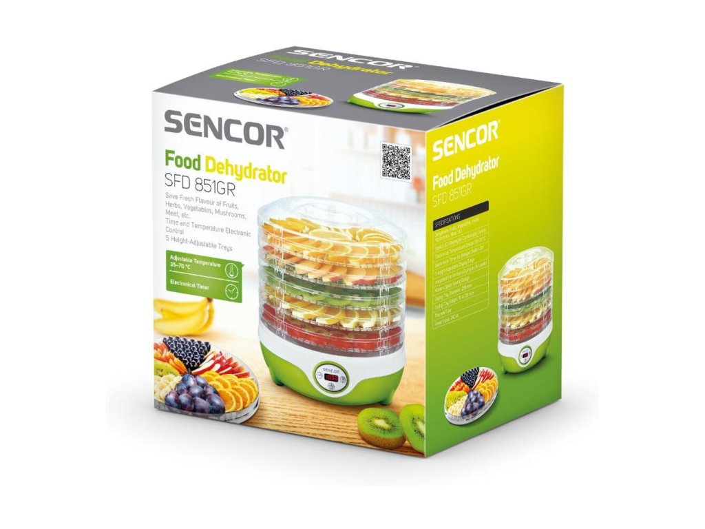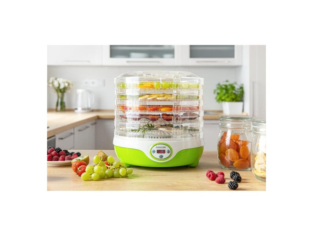 Kompaktná sušička potravín ponúka 5 sušiacich podnosov s nastaviteľnou výškou. Oceníte podsvietený LED displej, elektronický časovač na neskoršie vypnutie a integrovaný ventilátor, ktorý napomáha rovnomernému sušeniu na všetkých poschodiach. Elektronická regulácia teploty 35 – 70 °C umožňuje zachovať maximálne množstvo prírodných látok.