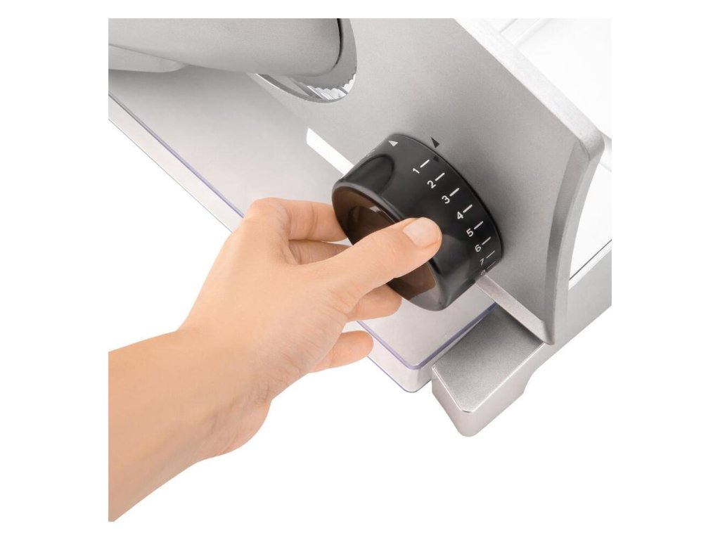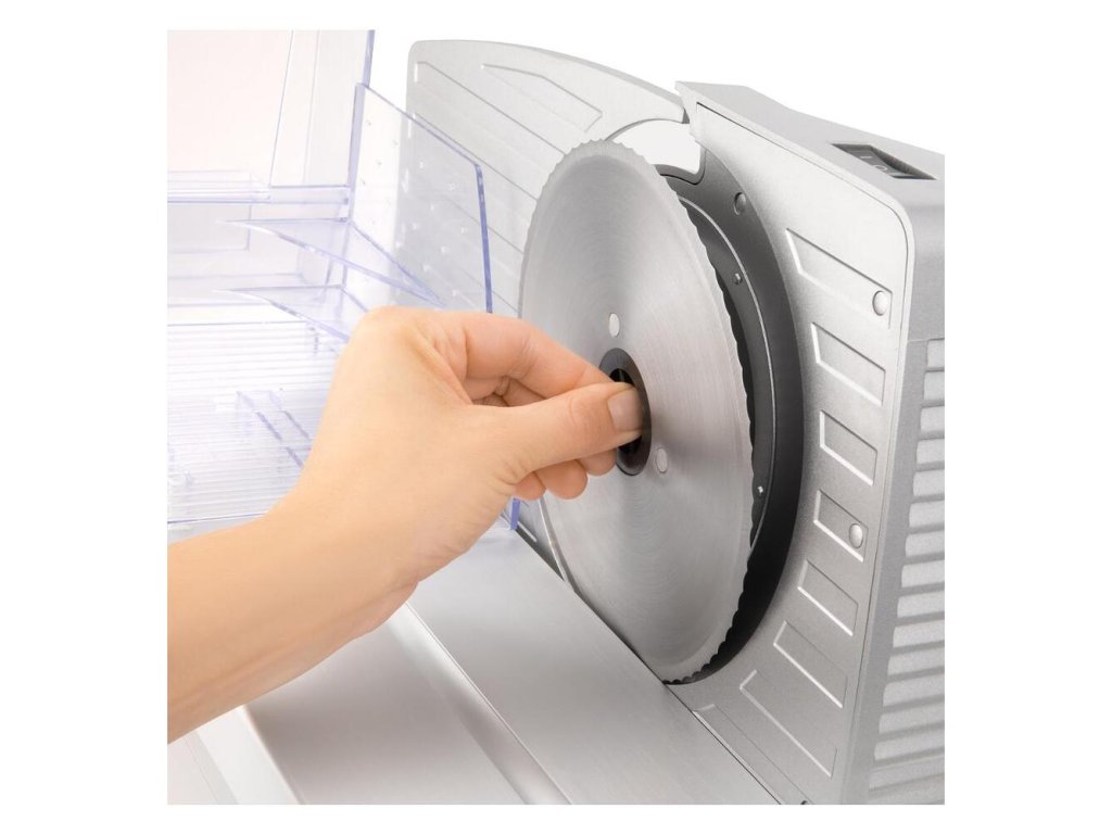 - Odnímateľné časti na jednoduché čistenie a umývanie (pojazd, prítlačný podávač, krájací kotúč)