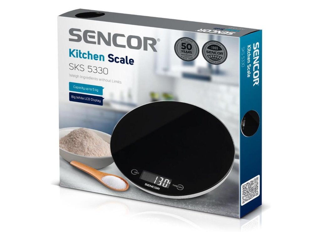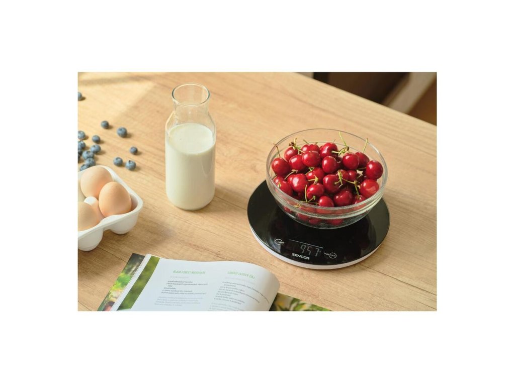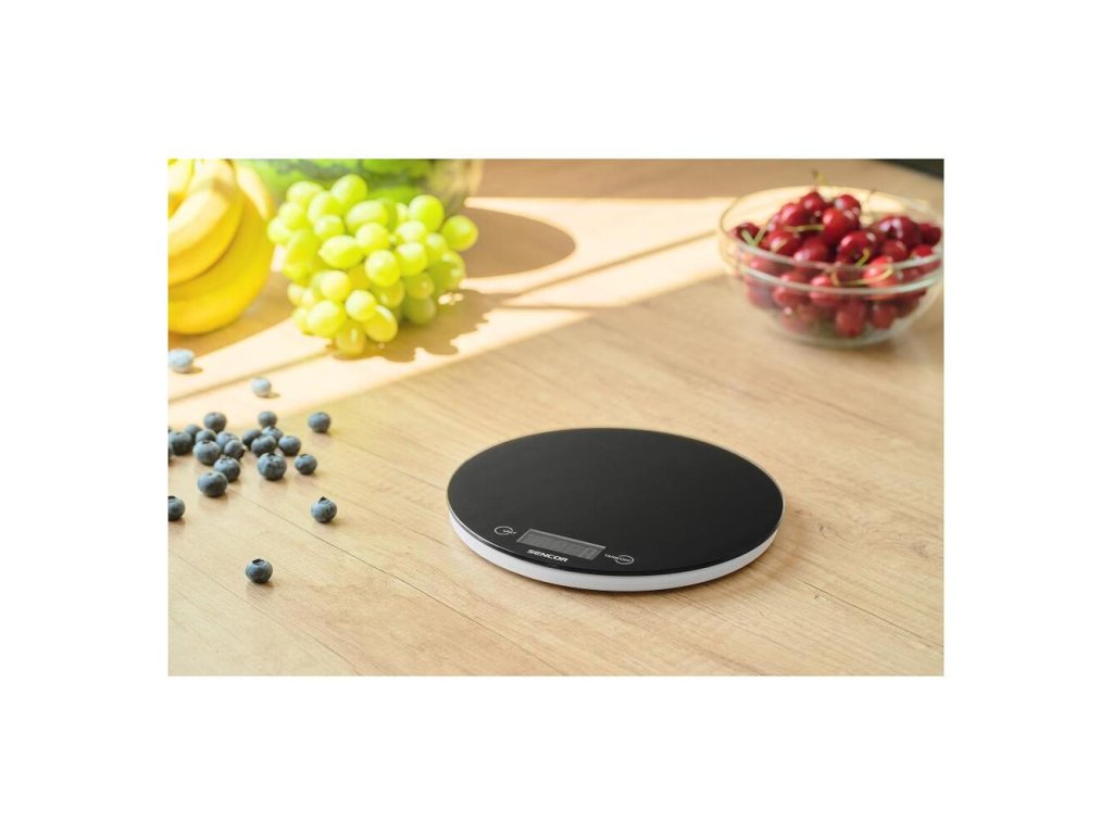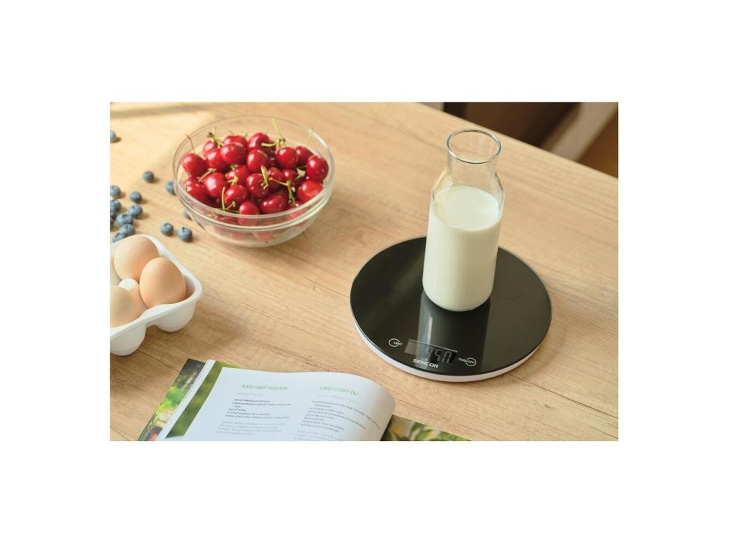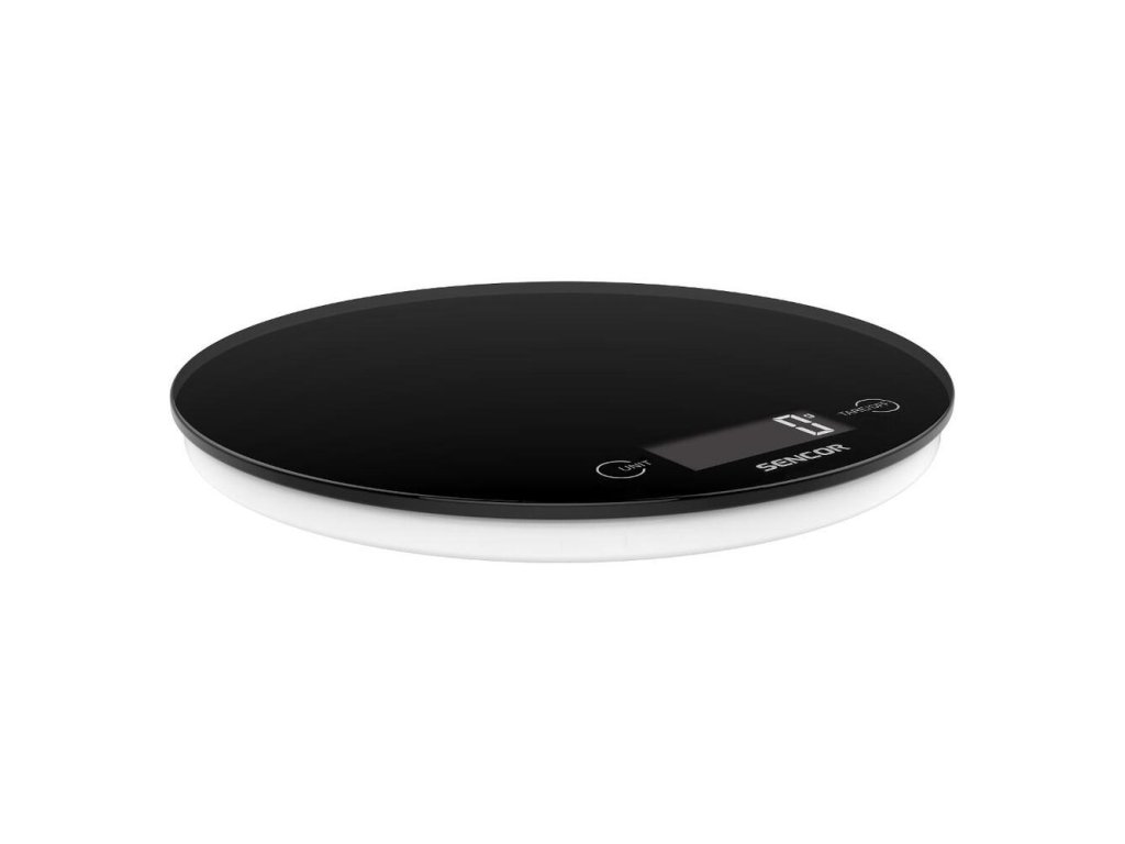 Elegantná kuchynská váha s čistým dizajnom v kombinácii čiernej a bielej farby. Tlakové spustenie váhy. Jednoduché ovládanie pomocou dvoch dotykových tlačidiel priamo pri veľkom výborne čitateľnom bielo podsvietenom displeji. O presné váženie sa starajú senzory v nôžkach, preto je potrebné váhu umiestňovať na rovnú a pevnú plochu. Váha je tiež vhodná na dovažovanie ingrediencií a odčítanie vážených nádob. Ideálna na váženie potravín do 5 kíl s presnosťou váženia 1 g.