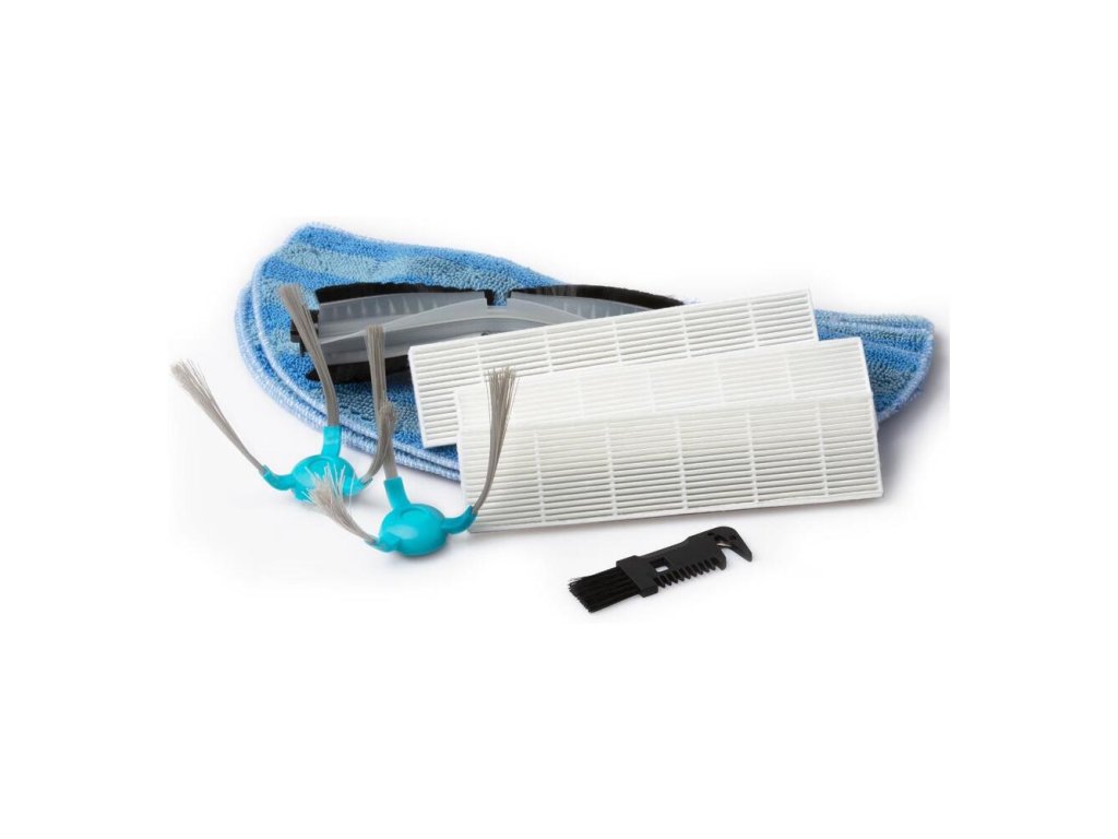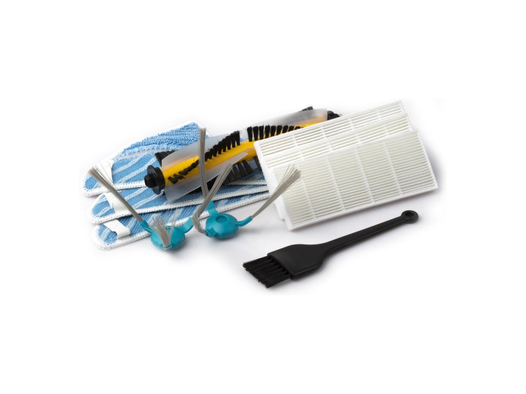 1 pár bočných kief, 1 stredová kefa, 3 handričky na vytieranie, 3 súpravy hepa filtrov, 1 čistiace zariadenie