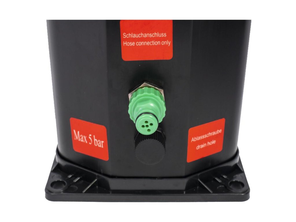 Multifunkčná solárna sprcha s veľkou sprchovou hlavicou, ktorá poskytuje príjemnú sprchu pripomínajúcu ľahký letný dážď. Sprcha je vyrobená z kvalitného PVC odolného voči UV žiareniu. Má XL nádrž s objemom 35 l, je vysoká 220 cm a je vybavená praktickým kohútikom na oplachovanie nôh. Sprcha má zároveň funkciu hmly, ktorá vás kedykoľvek osvieži. Pripojenie k prívodu vody je veľmi jednoduché pomocou rýchlospojky na hadicu (je súčasťou balenia).