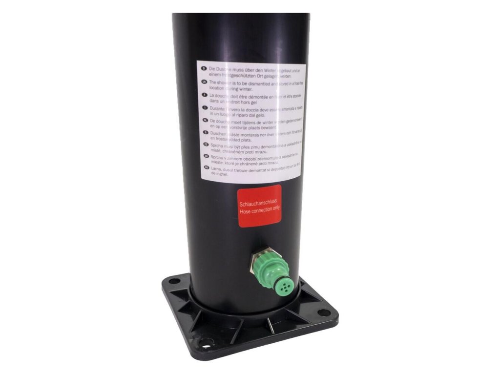 Inštalácia sprchy je veľmi jednoduchá a zvládnete ju sami. Solárna sprcha sa pripevňuje k základni pomocou 4 skrutiek, ktoré sú súčasťou balenia. Potom stačí pripojiť záhradnú hadicu a je hotovo. Ak nechcete sprchu pripevňovať k zemi, môžete si kúpiť podlahový stojan a sprchu pripevniť k nemu. Ak je základňa dostatočne veľká (napr. základňa solárnej sprchy CF), zabezpečí, že sprcha bude samonosná a nebude potrebné žiadne ďalšie kotvenie. Podstavec je praktickým doplnkom solárnej sprchy - je protišmykový, bezpečný a má odtok vody. Sprchu pripevnenú k podstavcu možno ľahko premiestniť na iné miesto v záhrade.