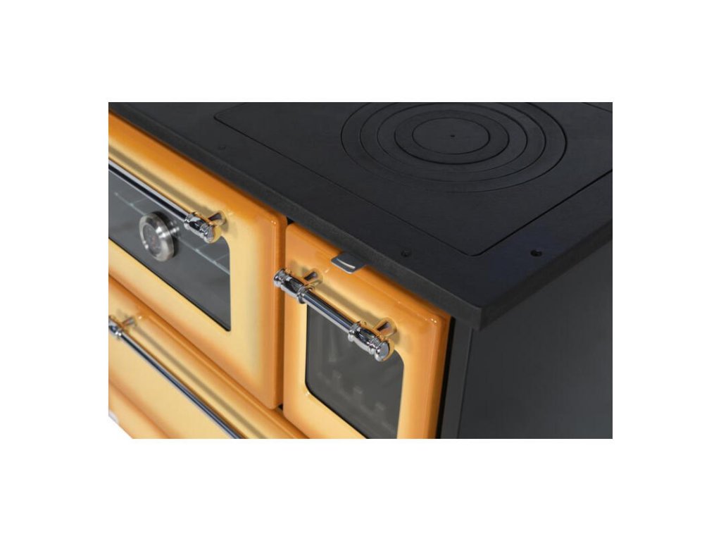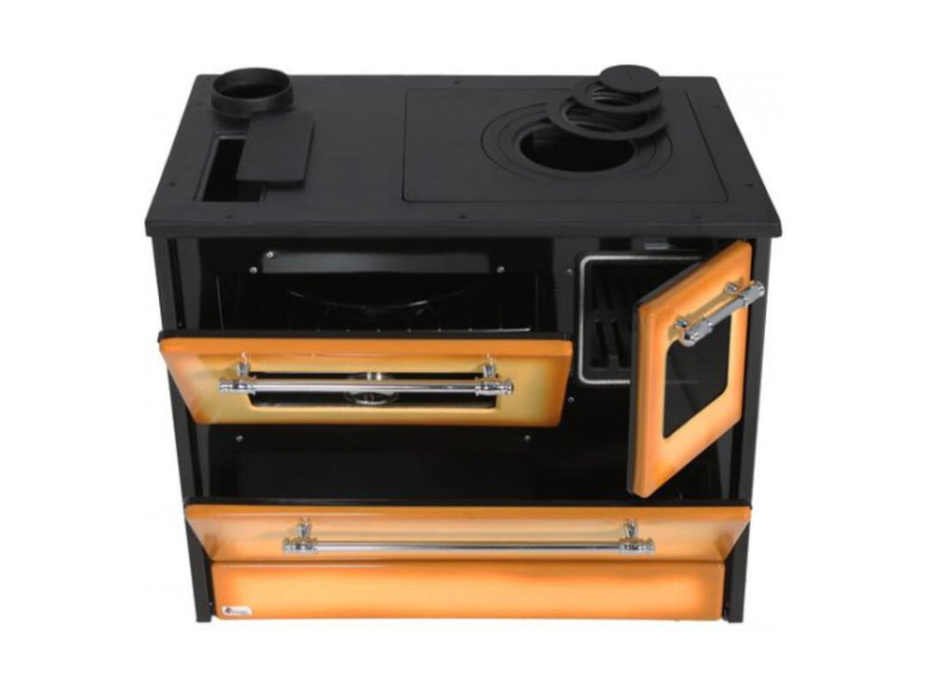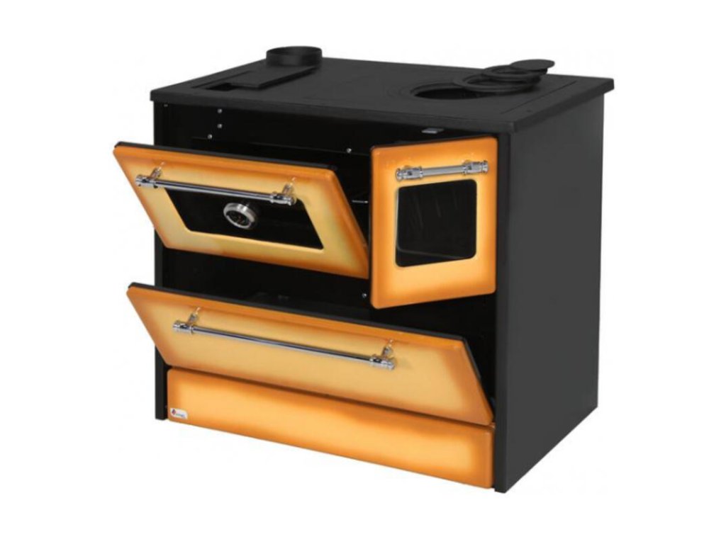 Sporák disponuje varnými platňami, regulátorom prívodu vzduchu a prúdenia tepla, praktickými dvierkami ohniska a dvierkami rúry na pečenie.
