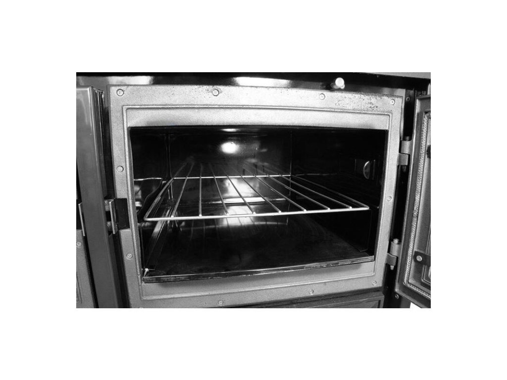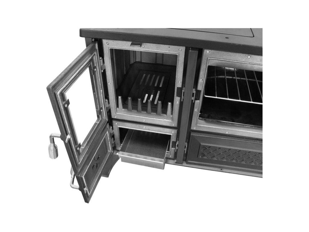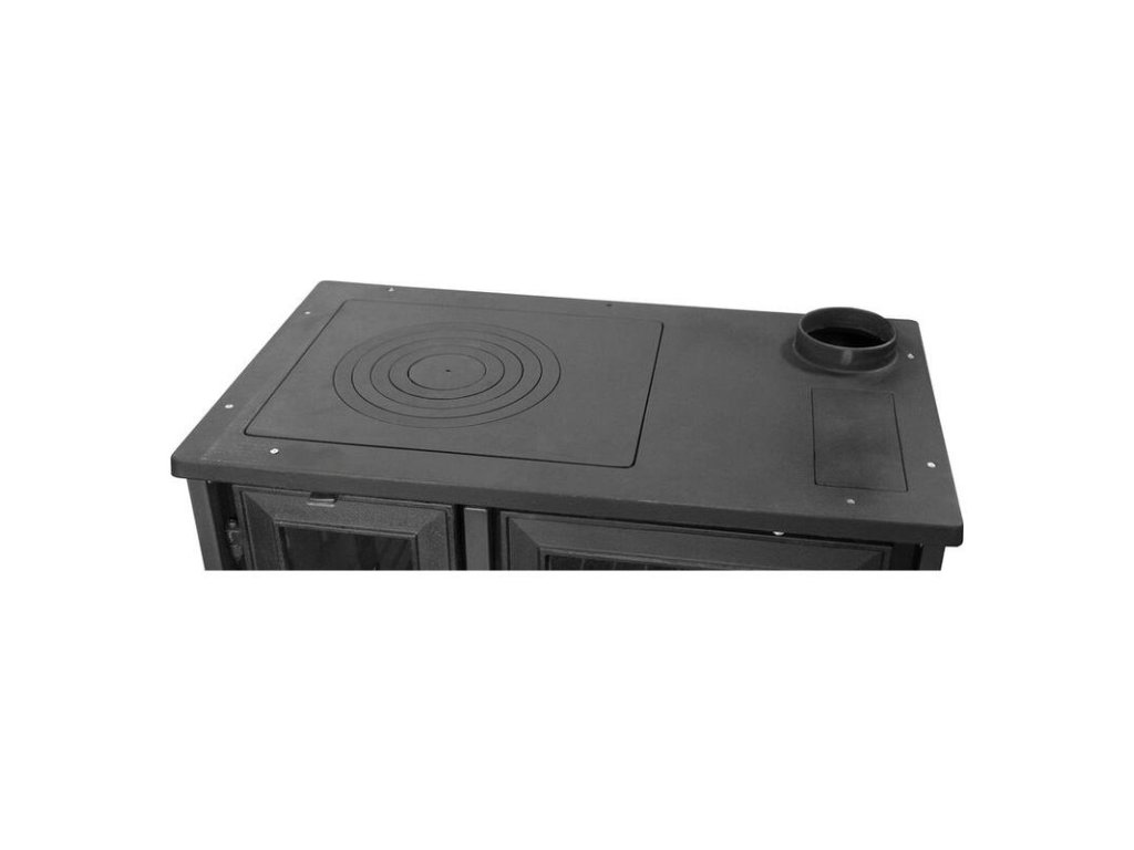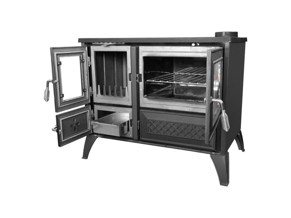 Sporák disponuje varnými platňami, regulátorom prívodu vzduchu a prúdenia tepla, praktickými dvierkami ohniska a dvierkami rúry na pečenie.