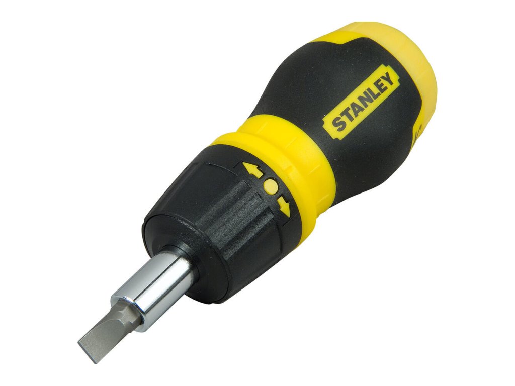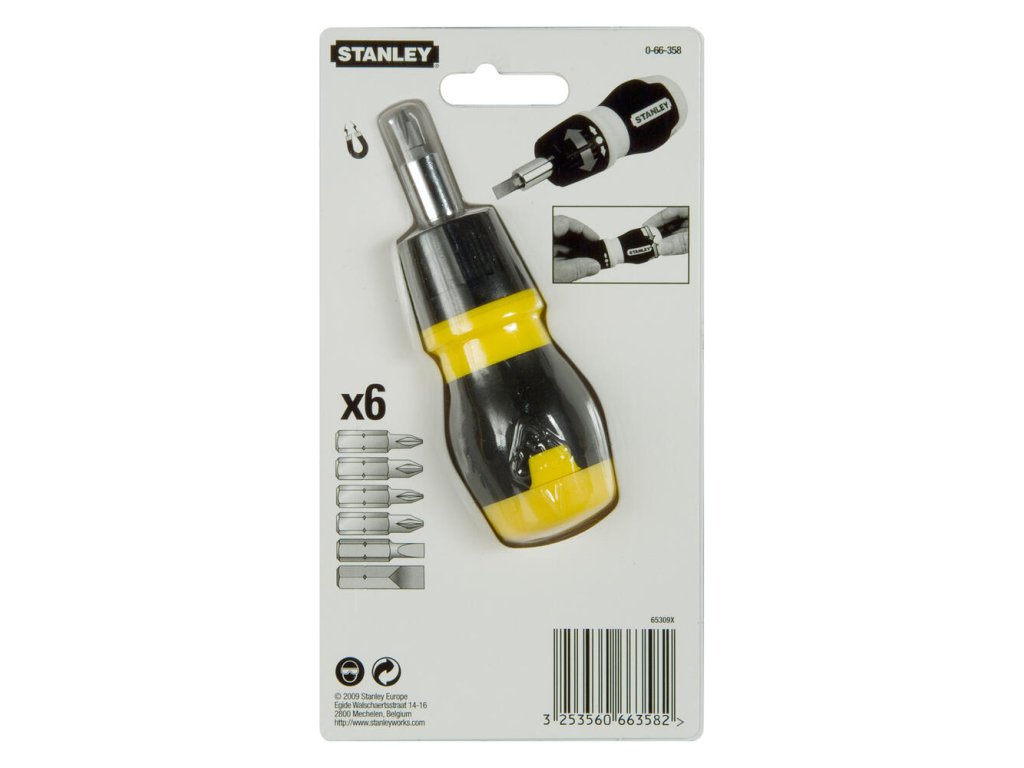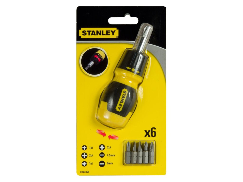 7-dielny set Stanley 0-66-358 obsahuje multibitový račňový skrutkovač s možnosťou zablokovania. Bity sú magneticky držané v drieku a integrovaný zásobník bitov priamo v rukoväti z odolného ABS zaisťuje rýchly prístup. Sada obsahuje 6 najpoužívanejších bitov (Phillips, Pozidriv, ploché).