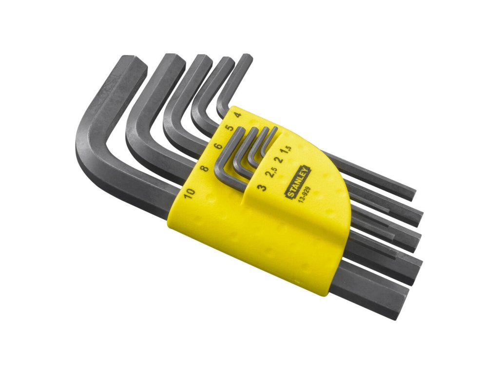 Praktická 9-dielna sada imbus kľúčov Stanley 1-13-929 pokrýva najpoužívanejšie rozmery od 1,5 do 10 mm. Kľúče sú vyrobené z vysoko kvalitnej kremíkovej ocele a ošetrené fosfátovanou povrchovou úpravou, ktorá ich chráni pred koróziou. Sada je uložená v kompaktnom plastovom držiaku pre jednoduché prenášanie a skladovanie.