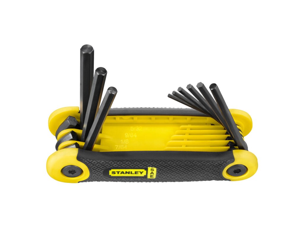 9-dielna nožová sada imbus kľúčov Stanley 2-69-265 v palcových rozmeroch je skladacia kapesná súprava, ideálna pre americké normy. Pohodlná ergonomická rukoväť s pryžovým povrchom zaisťuje pevný úchop. Kľúče sú čierne fosfátované a majú zrazené hrany pre jednoduchšie zavedenie do otvoru v hlave skrutky.