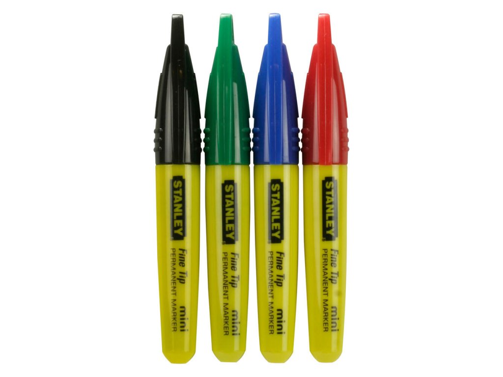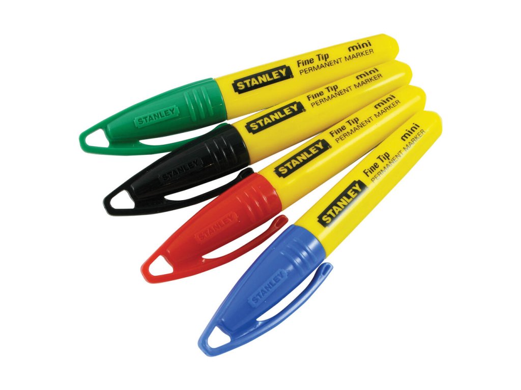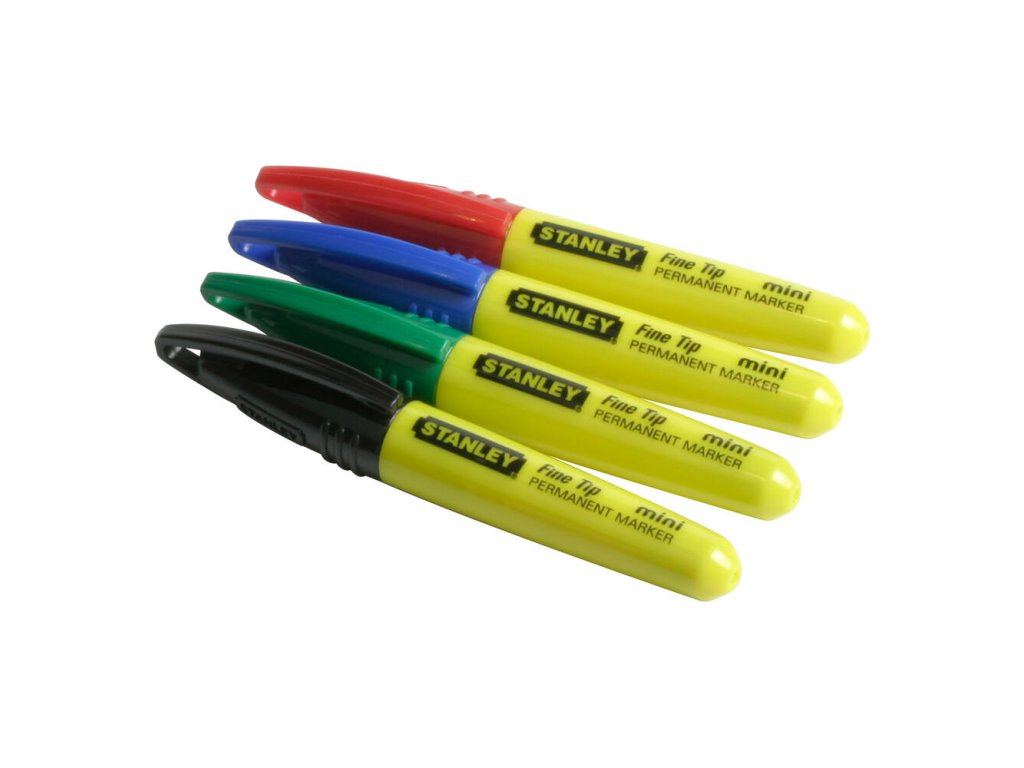 Sada 4 kusov mini značkovačov Stanley s jemným hrotom. Sada obsahuje 4 farby: červenú, zelenú, modrú a čiernu. Atrament je permanentný a vodeodolný. Sú vhodné na značenie na betón, meď, drevo, kov a ďalšie materiály.