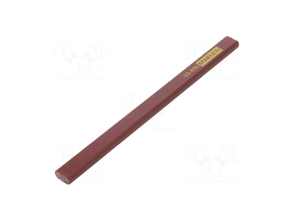 Klasická tesárska ceruzka Stanley v červenej farbe. Má oválny tvar, ktorý zabraňuje kotúľaniu, a hranatú tuhu s tvrdosťou HB.