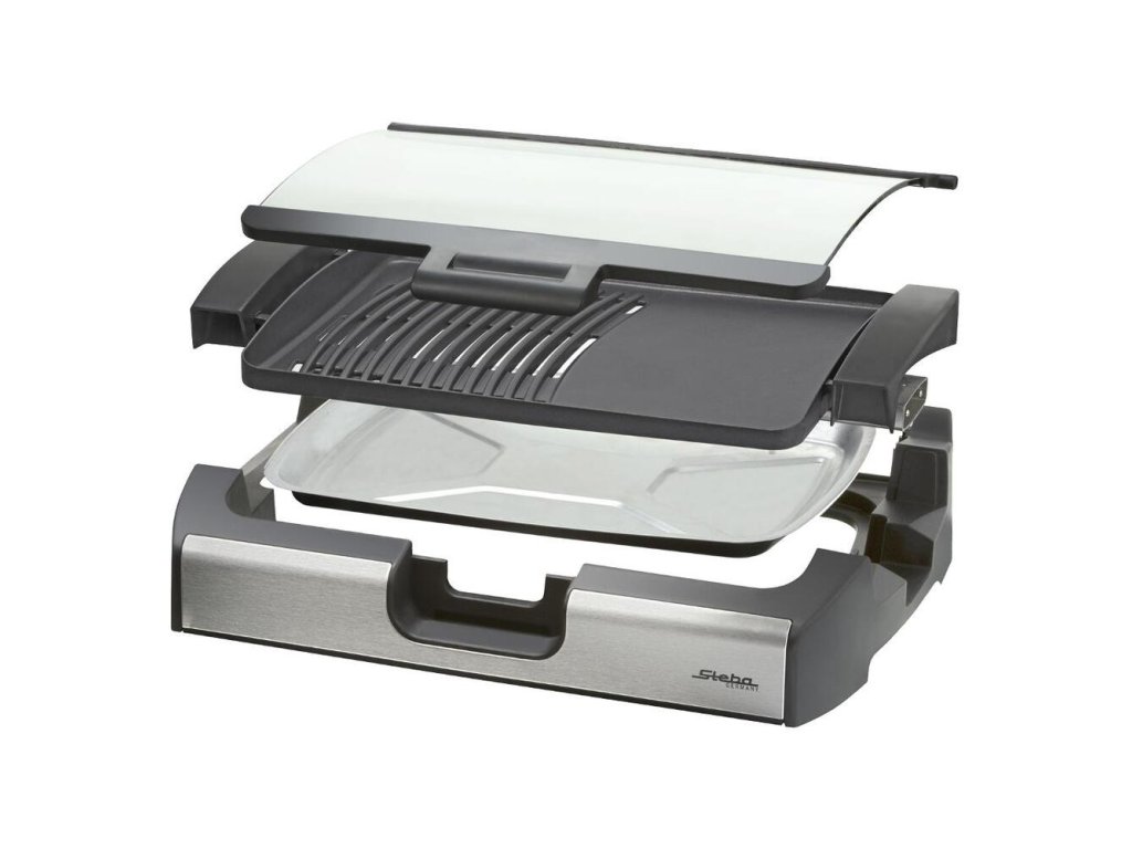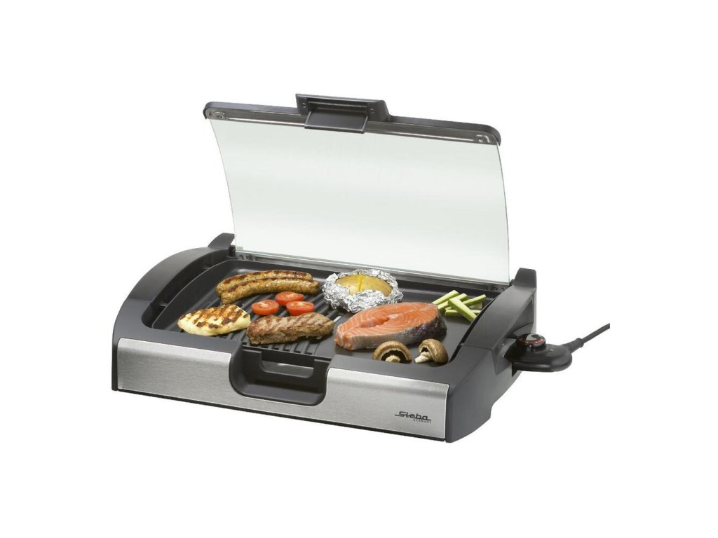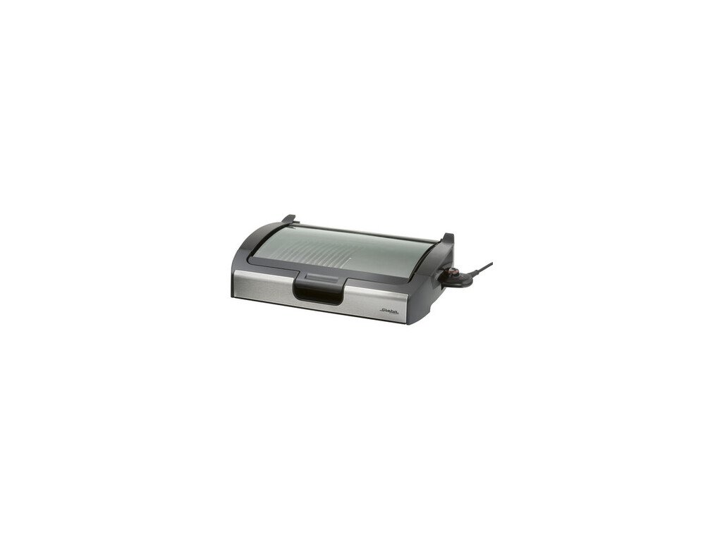 Stolný gril so skleneným poklopom, veľká grilovacia doska z alumíniovej liatiny s nepriľnavým povrchom (29,5 x 40 cm), poklop zo skla pre urýchlenie prípravy pokrmov, nadbytočný tuk odteká do samostatnej nádoby - príprava pokrmov s minimom tuku, jednoduché a rýchle čistenie nepriľnavých plôch, plynulá regulácia teploty, teplotný kontrolka, príkon 2200 W, farba: čierna / sivá