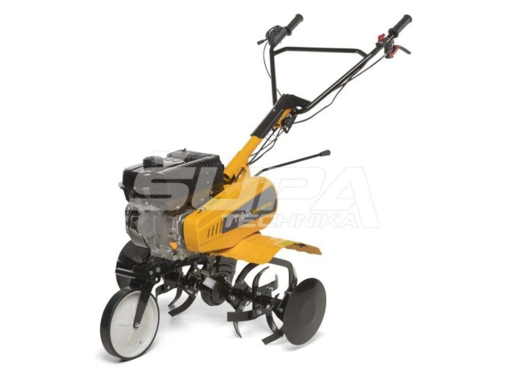- Rotačný kultivátor s benzínovým motorom s objemom 182 cm3, svetlou šírkou 85 cm, pracovnou hĺbkou 15 cm, šiestimi kovovými rotormi a jedným predným kolesom.