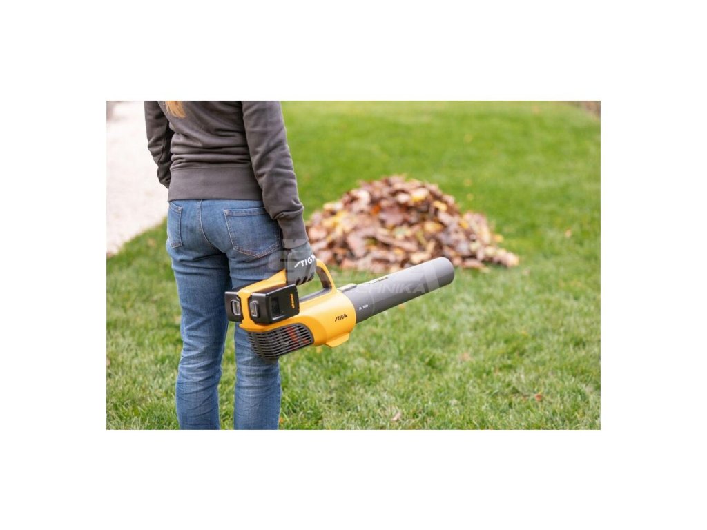 - Akumulátorový záhradný fukár lístia Stiga BL 300e Kit poháňaný batériami 2x20 V (4 Ah) vytvára potrebnú rýchlosť vzduchu pre ľahké odstraňovanie lítia a nečistôt.