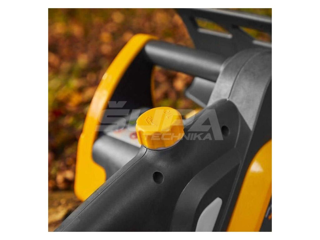 - Píla je vybavená ručnou brzdou reťaze, automatickým olejovým čerpadlom s kontrolným oknom a otáčaním skrutky, ktorou je možné nastaviť správne napnutie reťaze.