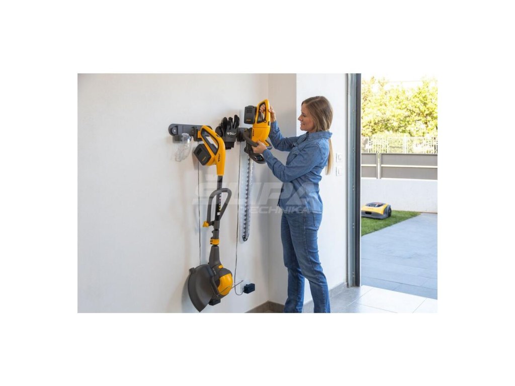 - Vďaka priloženému úložnému systému naviac môžete náradie zavesiť na stenu pre uskladnenie a dobíjanie.
