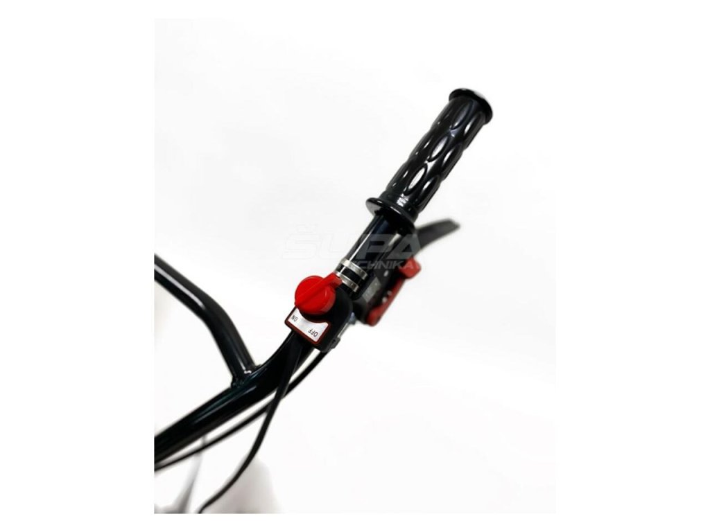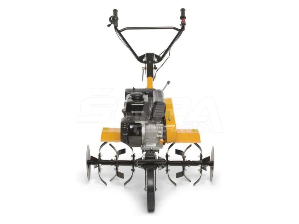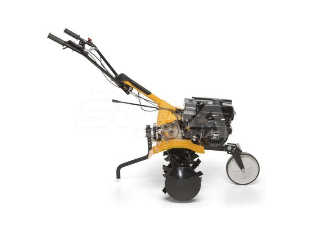 Rotačný kultivátor s benzínovým motorom s objemom 182 cm3, svetlou šírkou 85 cm, pracovnou hĺbkou 15 cm, šiestimi kovovými rotormi a jedným predným kolesom.