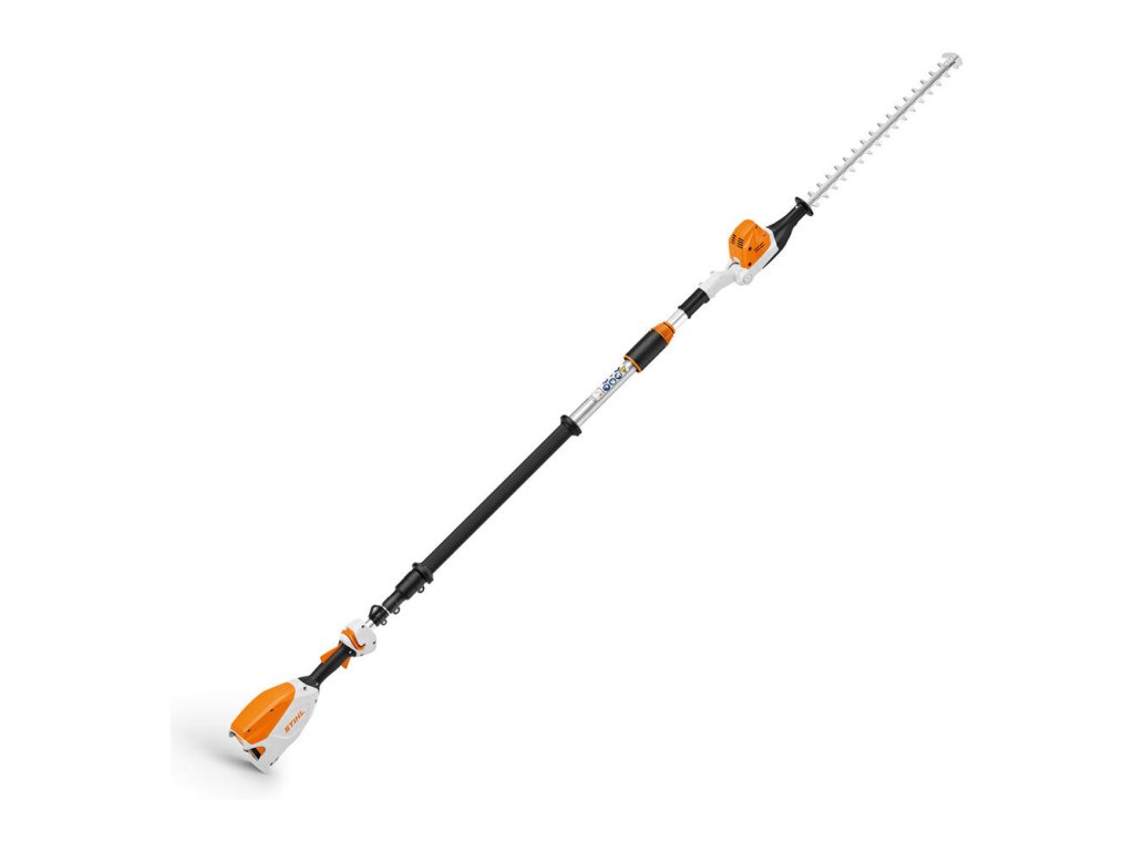 Akumulátorové zahradné nnožnice na živý plot pre profesionálne nasadenie pri údržbe vysokých a širokých živých plotov. Konštantný zdvih nožov pri zaťaži, sklopné, ideálne nastaviteľné pre strihanie nad hlavou, zo strany a od zeme, o 115° nastaviteľná nožová lišta, veľký dosah, obojstranne brúsené nože, prepravná dĺžka 180 cm, celková dĺžka 330 cm, hmotnosť 4,8 kg.Dodávané bez akumulátora a bez nabíjačky.