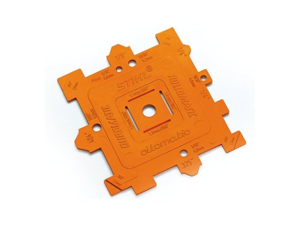 - Funkcie: Meranie delenia zubov reťaze, hrúbky vodiaceho článku a šírky drážky vodiacej lišty.
