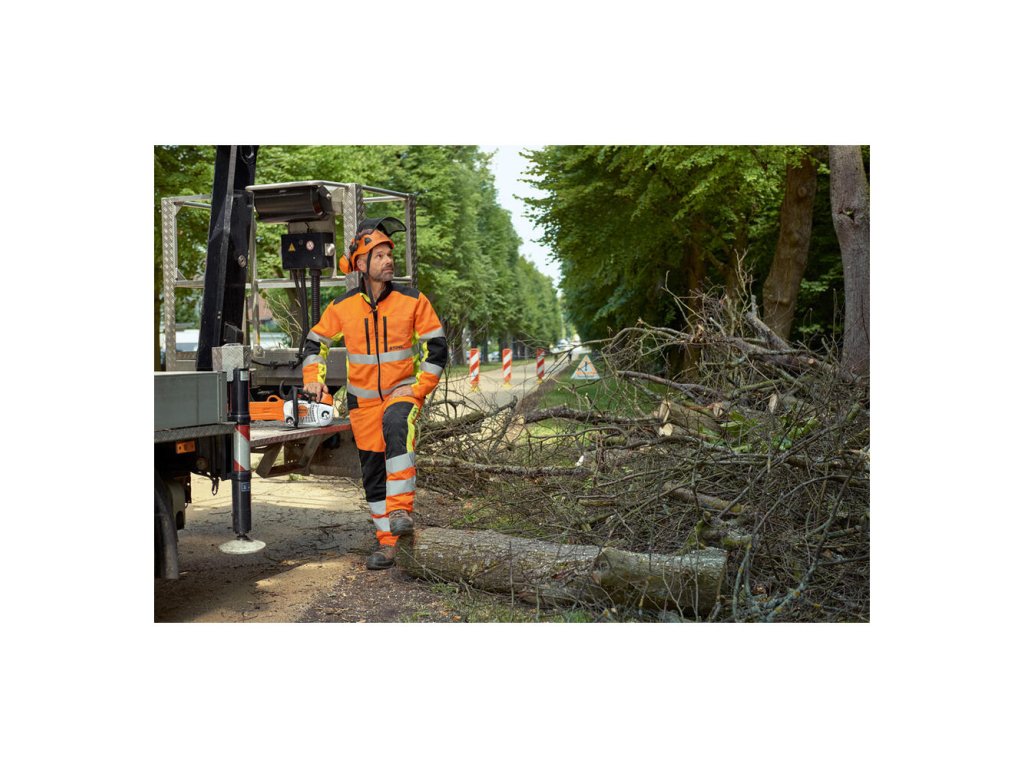 Pevné a pohodlné ochranné nohavice pre prácu s motorovou pílou z mixu funkčných materiálov. Skvelá voľnosť pohybu. Výrazná oranžová farba pre zvýšenú bezpečnosť (EN ISO 20471). Použitý materiál: 100% Polyester/ 65% polyester a 35% bavlna. Spevnený materiál na kolenách a spodnej časti nohy. Dve bočné vrecká, jedna zadná kapsička, jedna meračná priehradka, ochrana obličiek, a zvýšený chrbát na ochranu proti podchladeniu. EN 381, ochranná úroveň 1 (= 20 m / s).