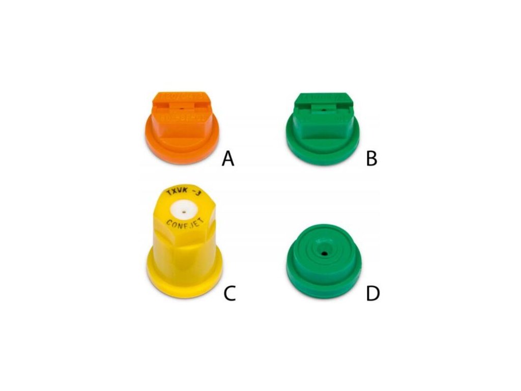 A) Plochá dýza, 400 cc/min (kvety, ovocné škôlky, tráva) B) Plochá dýza, 600 cc/min (plošný postrek s insekticídmi, herbicídmi a fungicídmi) C) Dýza s dutým kužeľom, 200 cc/min (ošetrovanie kríkov, stromov, jednotlivých rastlín) D) Dýza s dutým kužeľom, 600 cc/min (postrek jednotlivých rastlín s insekticídmi, herbicídmi a fungicídmi)