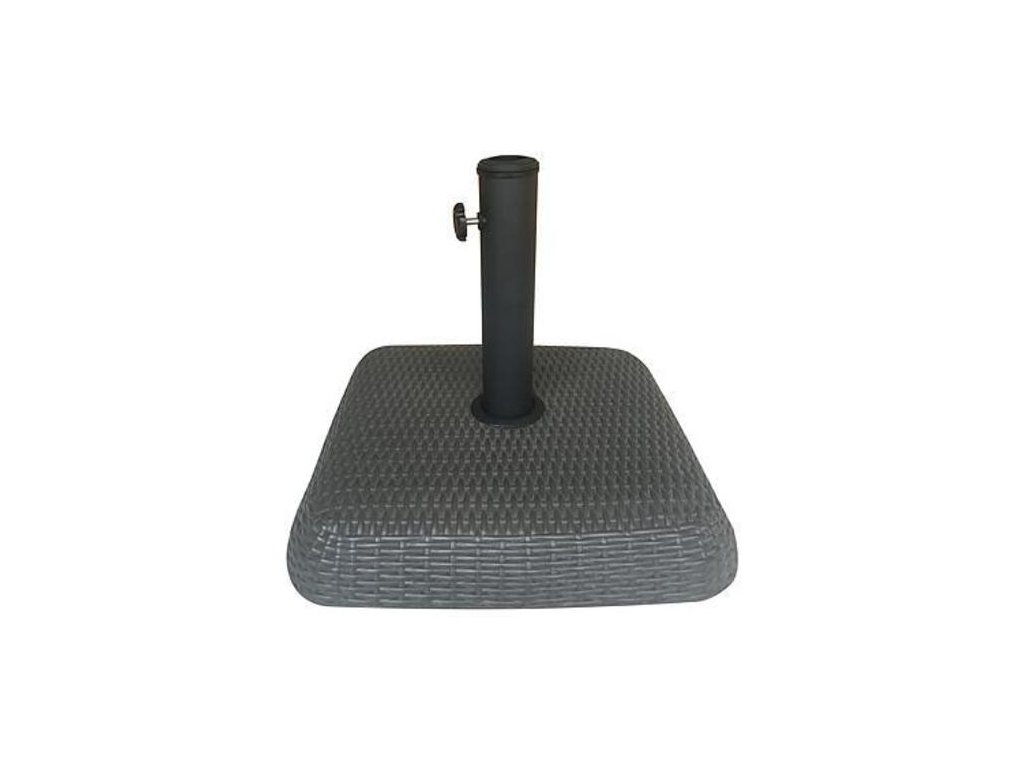 Stojan na dáždnik má štvorcovú podstavu a je vyrobený z betónu, čomu odpovedá aj jeho hmotnosť 29,7 kg. Výhodou takejto váhy je zabezpečená stabilita aj pre dáždniky s väčšími priemermi vrchných častí. Rovnako sa pri neprajných poveternostných podmienkach nemusíme báť o jeho prípadné odfúknutie či poškodenie. Zaujímavý je tiež dizajn, kedy sa celá betónová časť pokryla tmavohnedým pleteným poťahom. Priemer tejto podstavy je 46 cm a výška je 8 cm. Z podstavy vychádza tyč na ktorú sa následne napája dáždnik. Jednoducho ich do seba vsuniete a pomocou kolieska na boku ich zaistíte.