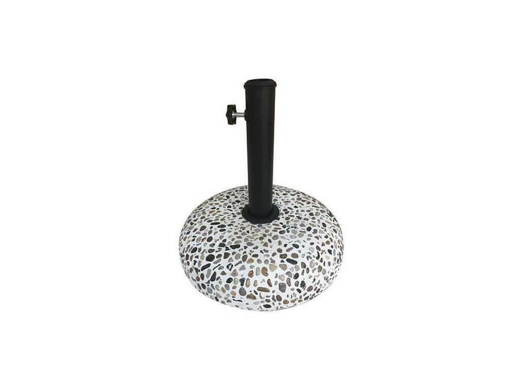 Stojan na slnečník má kruhový základ vyrobený z betónu. Jeho vrchný poťah pripomína mozaiku z malých kamienkov, čo vytvára pekný vzhľad. Hmotnosť stojana je 15,5 kg a preto poskytuje dostatočne pevný podklad pre dážniky a slnečníky. Zo stredu podstavy, ktorje priemer je 35 cm a výška 8 cm, vychádza tyč, do ktorej sa nasúva slnečník. Po jeho vložení stačí iba zakrútiť koliesko na bočnej strane, čím slnečník dostatočne zaistíte. Maximálny priemer možnej upevnenej tyče je 33 až 41 mm.
