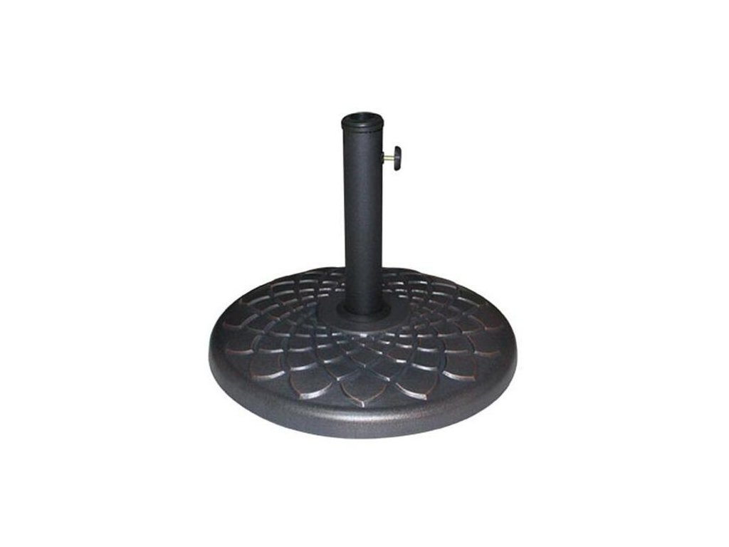 Stojan má kruhovú podstavu s priemerom 43 cm. Je vyrobený z trvácnej živice, čím sa nemusíte obávať o jeho životnosť. Vďaka svojej výraznej tmavej farbe a zaujímavej lupeňovej potlači bude nie len dekoratívny, ale tiež funkčný a praktický doplnok do každej záhrady. Slnečník sa napája do tyče vychádzajúcej zo stredu podstavy, dlhej 33 cm. Prekrytie častí stojanu a dážnika bude teda dostatočné nato, aby sa zabezpečila pevnosť celej konštrukcie. Priemer tyče dáždnika, ktorý sa nasadí do stojanu, môže byť maximálne 38 mm. Hmotnosť je až 25,66 kg, čo poskytuje bezpečný základ a stálosť.