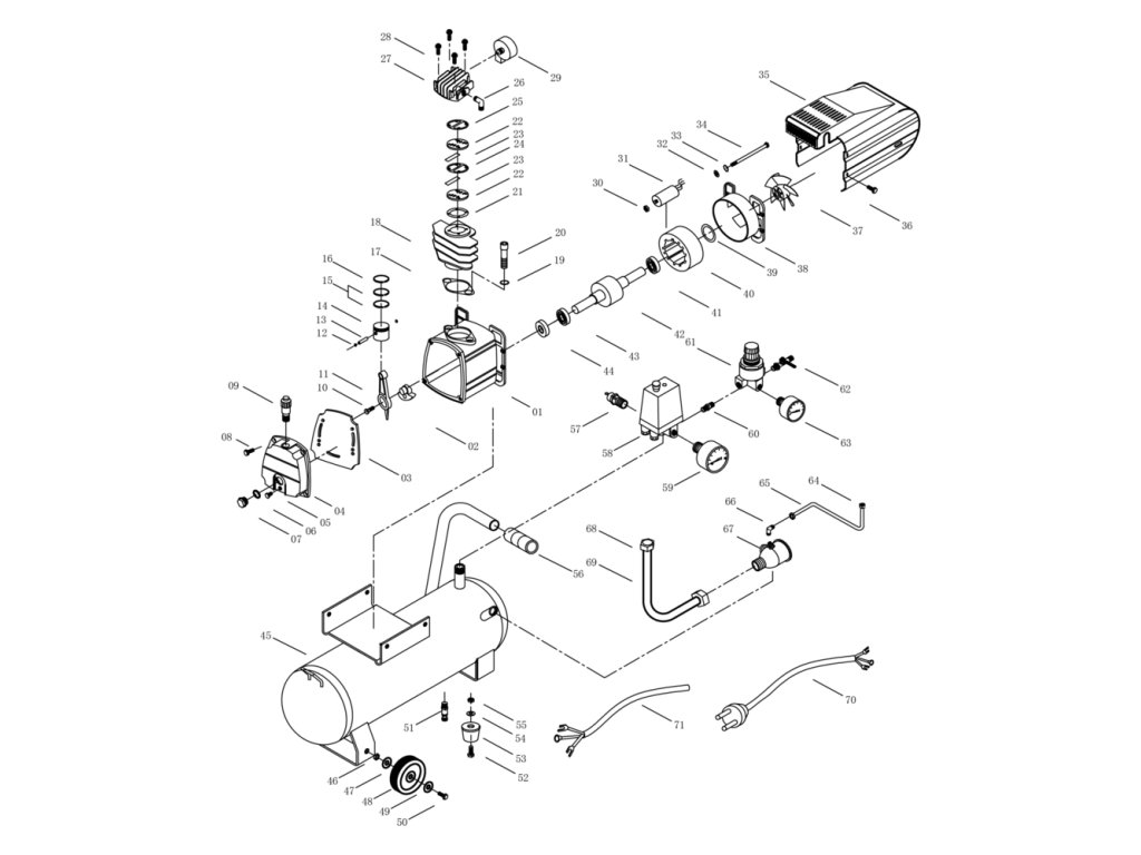 Výkon jedno-valcového motora až 1,5 kW efektívne dodá vzduch všade tam, kde je potrebný. Prevádzkový tlak vzduchu je nastaviteľný. Tlaková nádoba má objem 50 l, pri čom maximálny prietok vzduchu je 150 l / min.