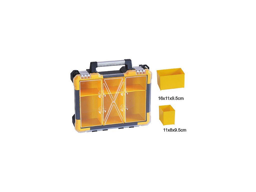 - Malý organizér v podobe kufra je v žlto-čiernej farbe s troma väčšími priehradkami a troma menšími.