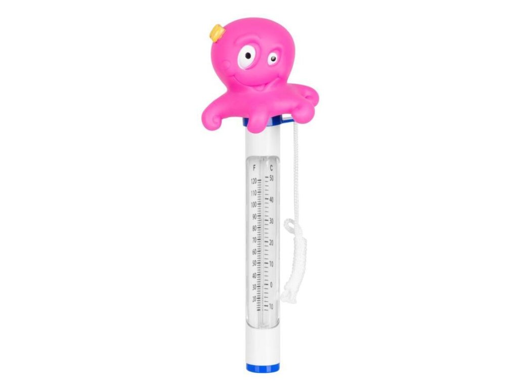 Plávajúci teplomer s chobotničkou obzvláštni každý bazén a presne pomerá teplotu vody. Pripevňuje sa pomocou pásika k bazénu, aby ostal na mieste. Teplomer zobrazuje hodnoty v stupňoch Celsia aj Fahrenheita.