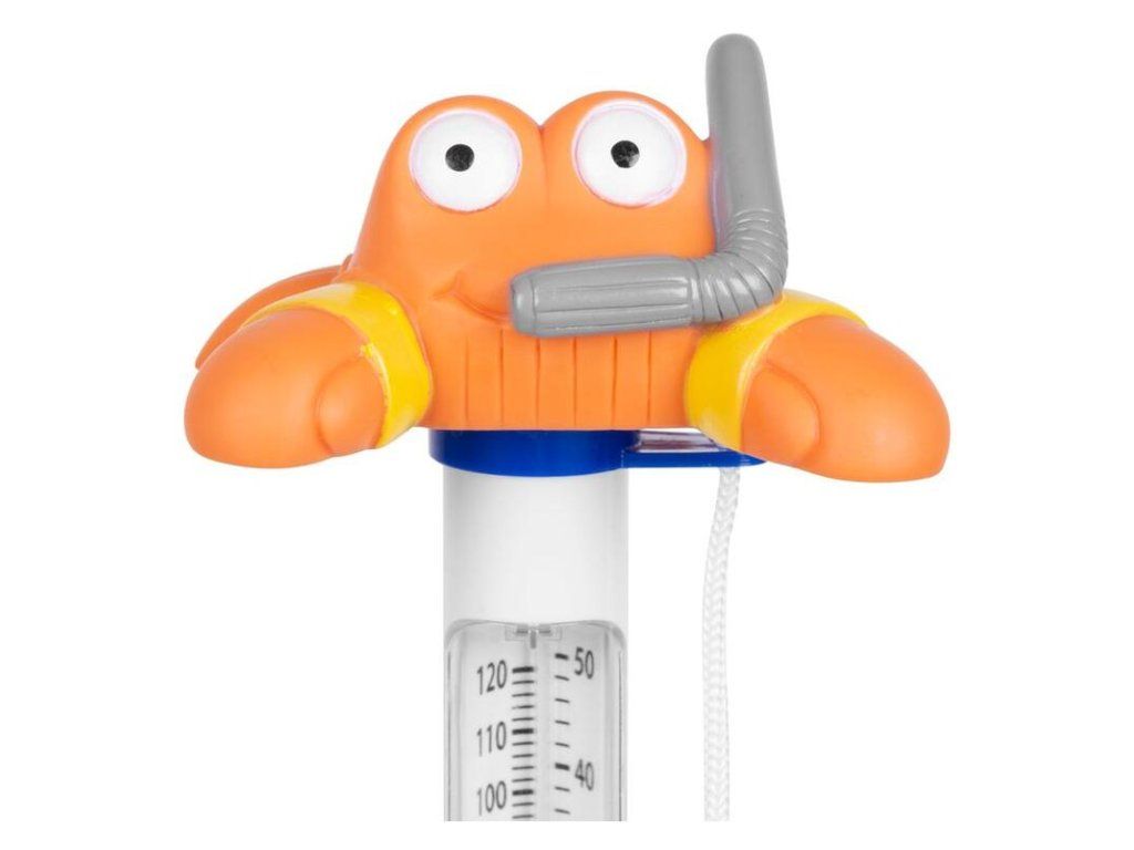Plávajúci teplomer s krabom obzvláštni každý bazén a presne pomerá teplotu vody. Pripevňuje sa pomocou pásika k bazénu, aby ostal na mieste. Teplomer zobrazuje hodnoty v stupňoch Celsia aj Fahrenheita.